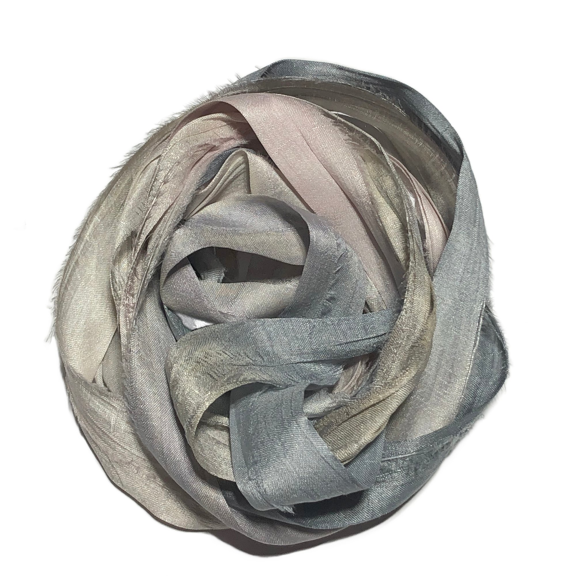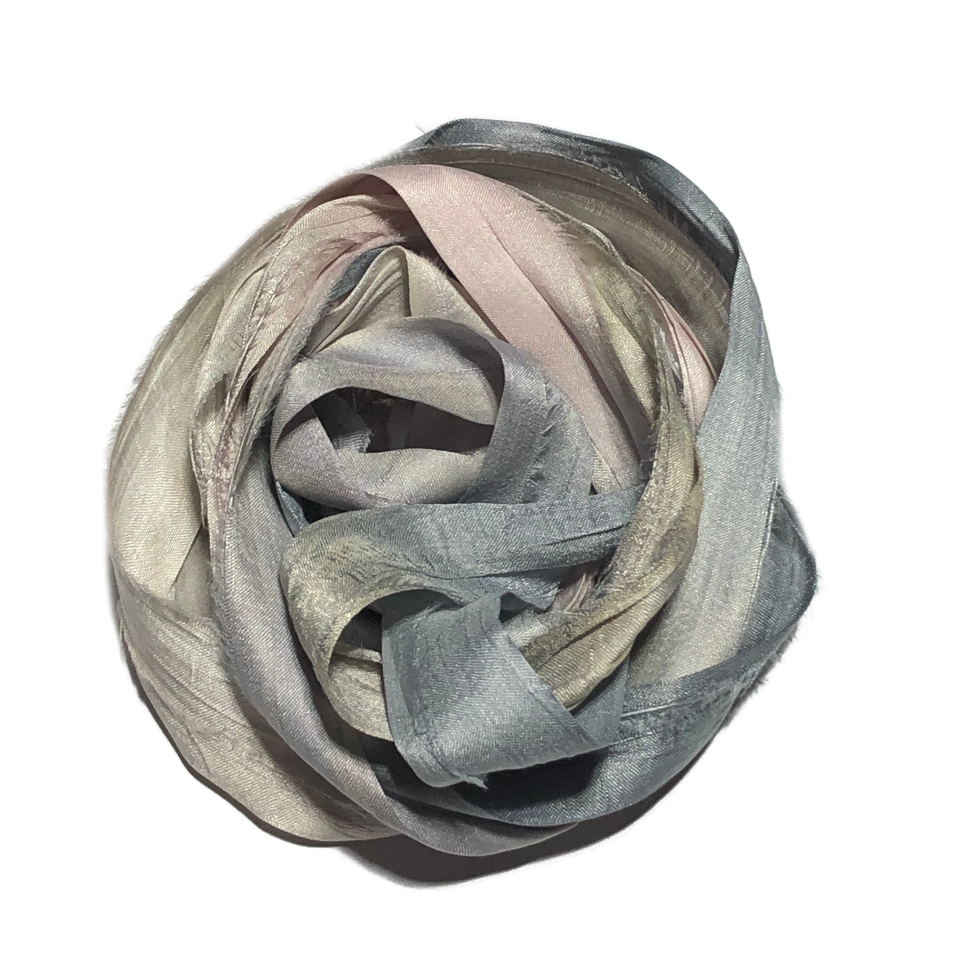 HAND DYED SARI SILK BUNDLES, ARE MADE OF 100% PURE SILK. THIS RECYCLED SILK RIBBON HAS BEEN HAND DYED TO THE BEAUTIFUL SOLIDS OR VARIATED COLOR YOU SEE IN EACH OF OUR UNIQUE BUNDLES.