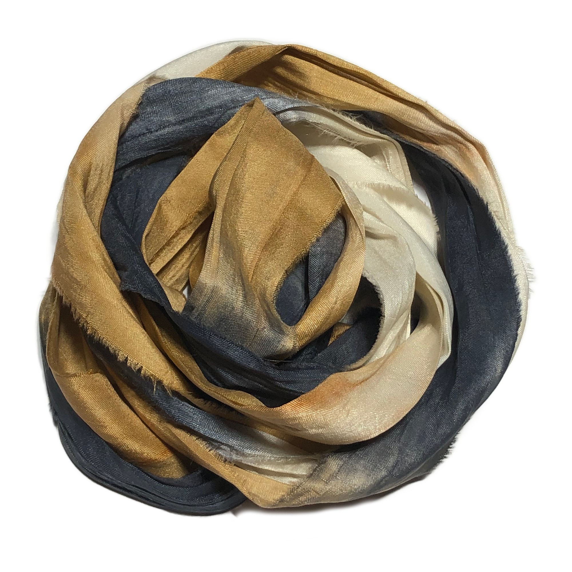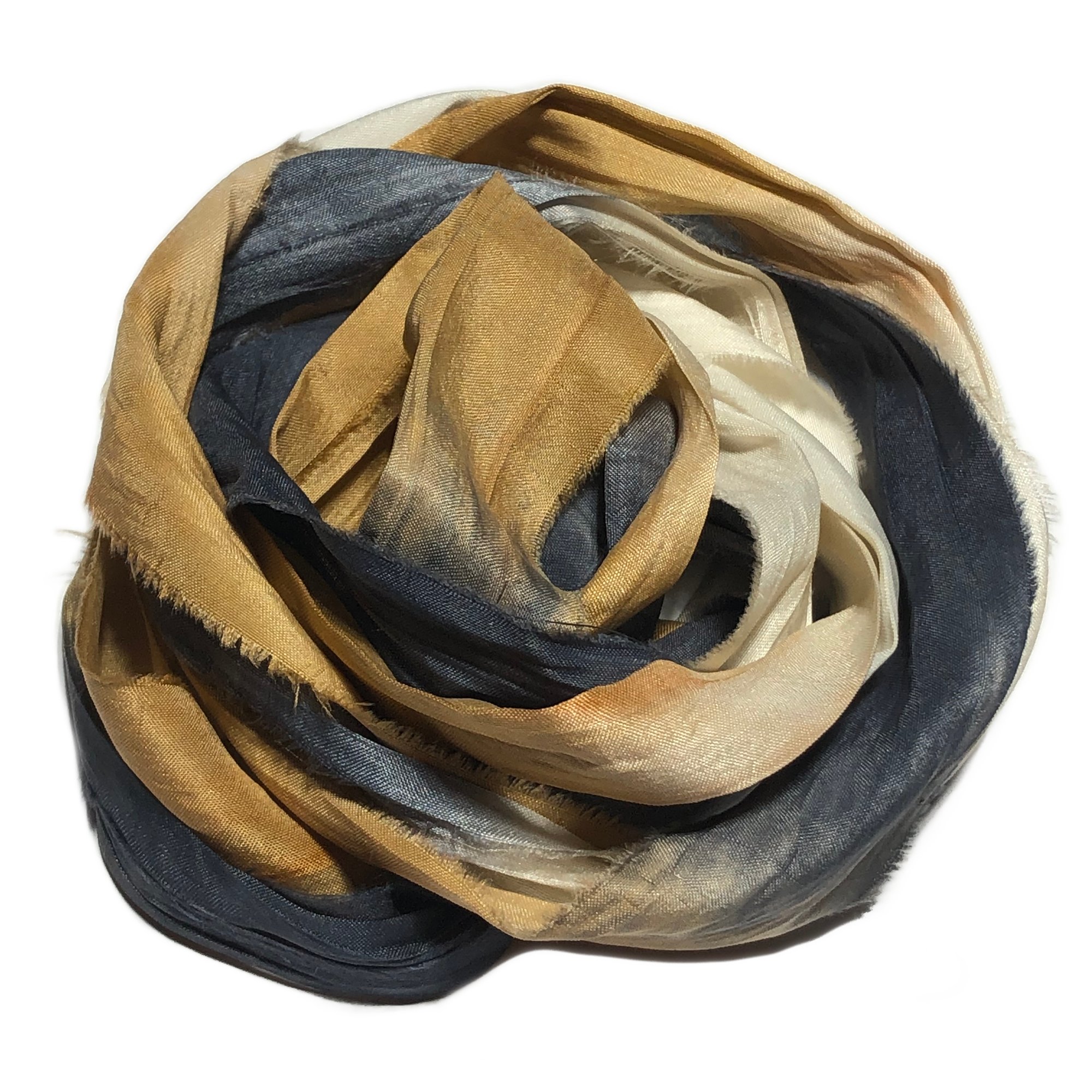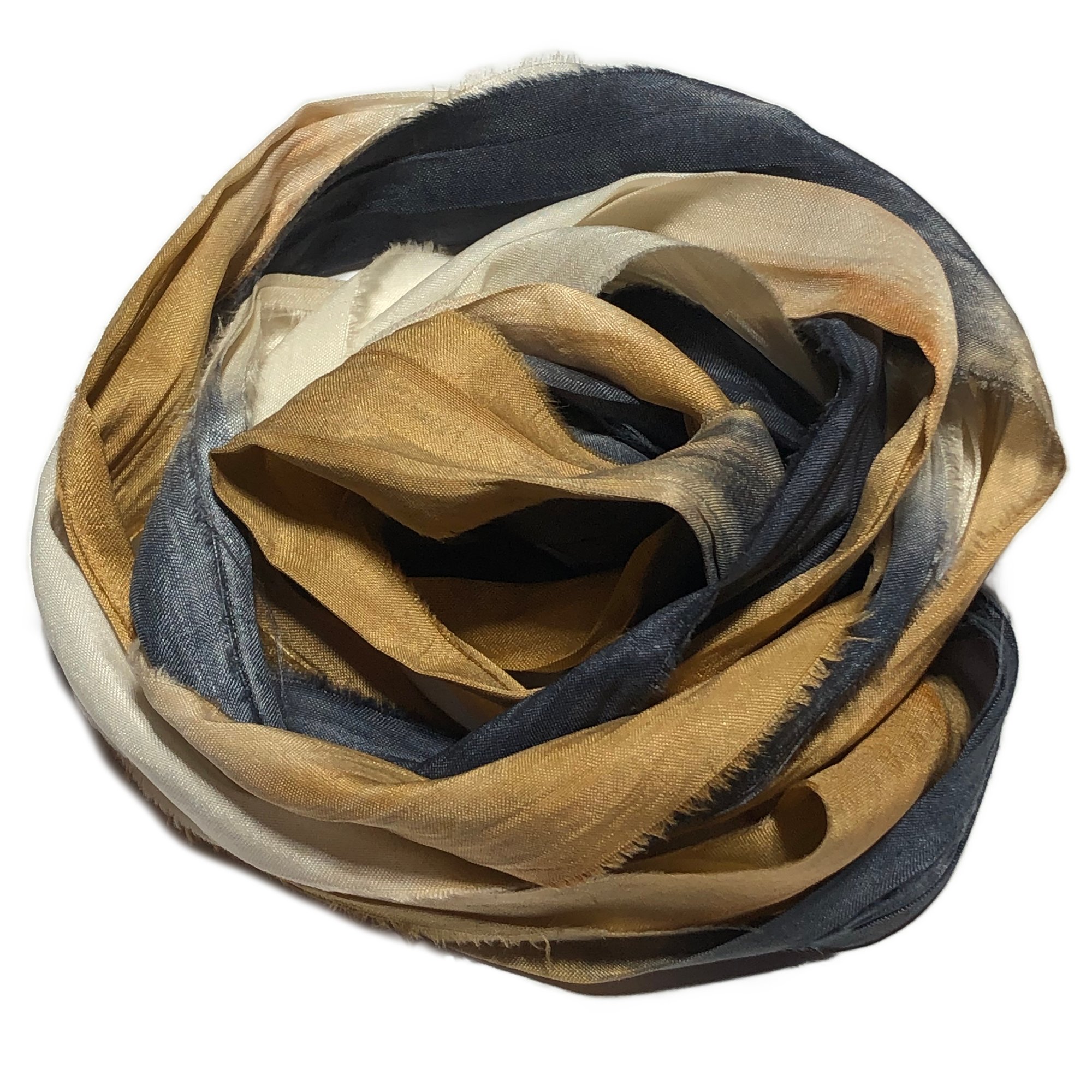 HAND DYED SARI SILK BUNDLES, ARE MADE OF 100% PURE SILK. THIS RECYCLED SILK RIBBON HAS BEEN HAND DYED TO THE BEAUTIFUL SOLIDS OR VARIATED COLOR YOU SEE IN EACH OF OUR UNIQUE BUNDLES.
