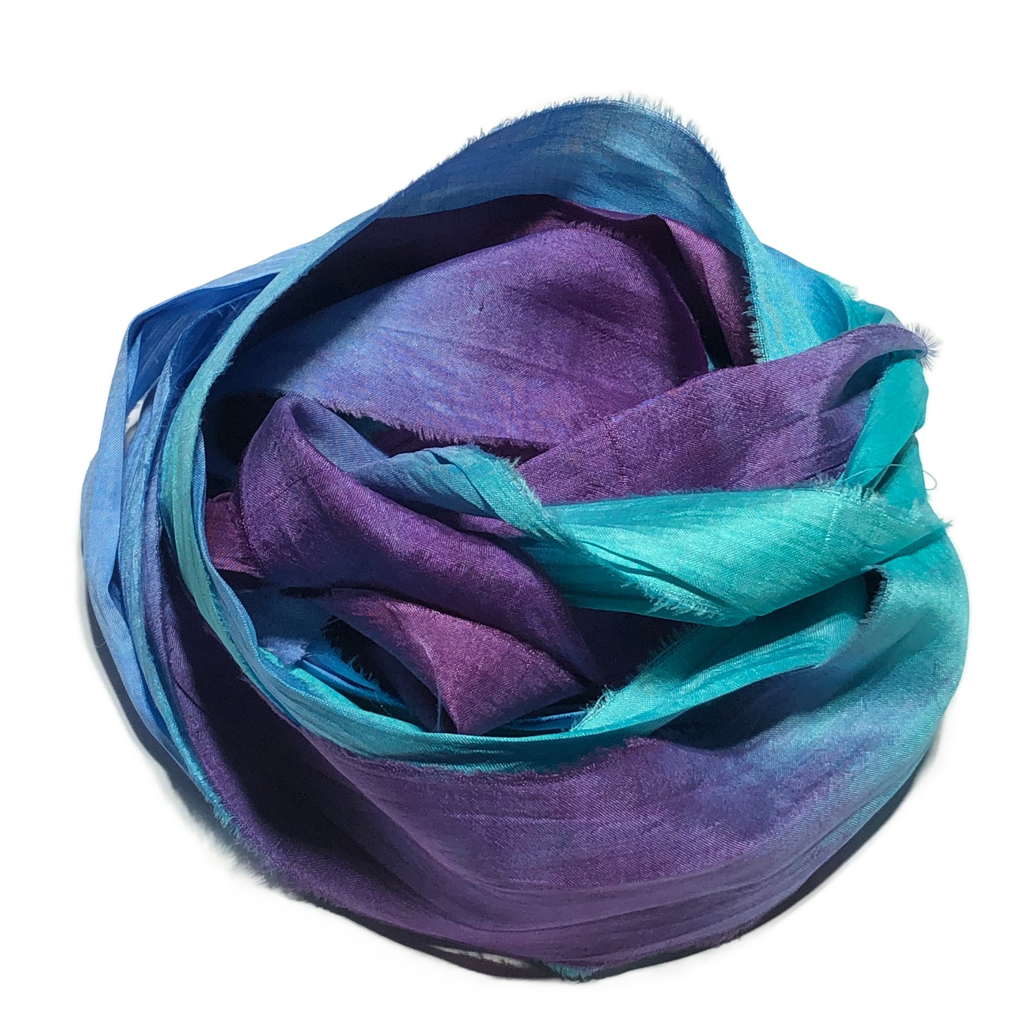 HAND DYED SARI SILK BUNDLES, ARE MADE OF 100% PURE SILK. THIS RECYCLED SILK RIBBON HAS BEEN HAND DYED TO THE BEAUTIFUL SOLIDS OR VARIATED COLOR YOU SEE IN EACH OF OUR UNIQUE BUNDLES.