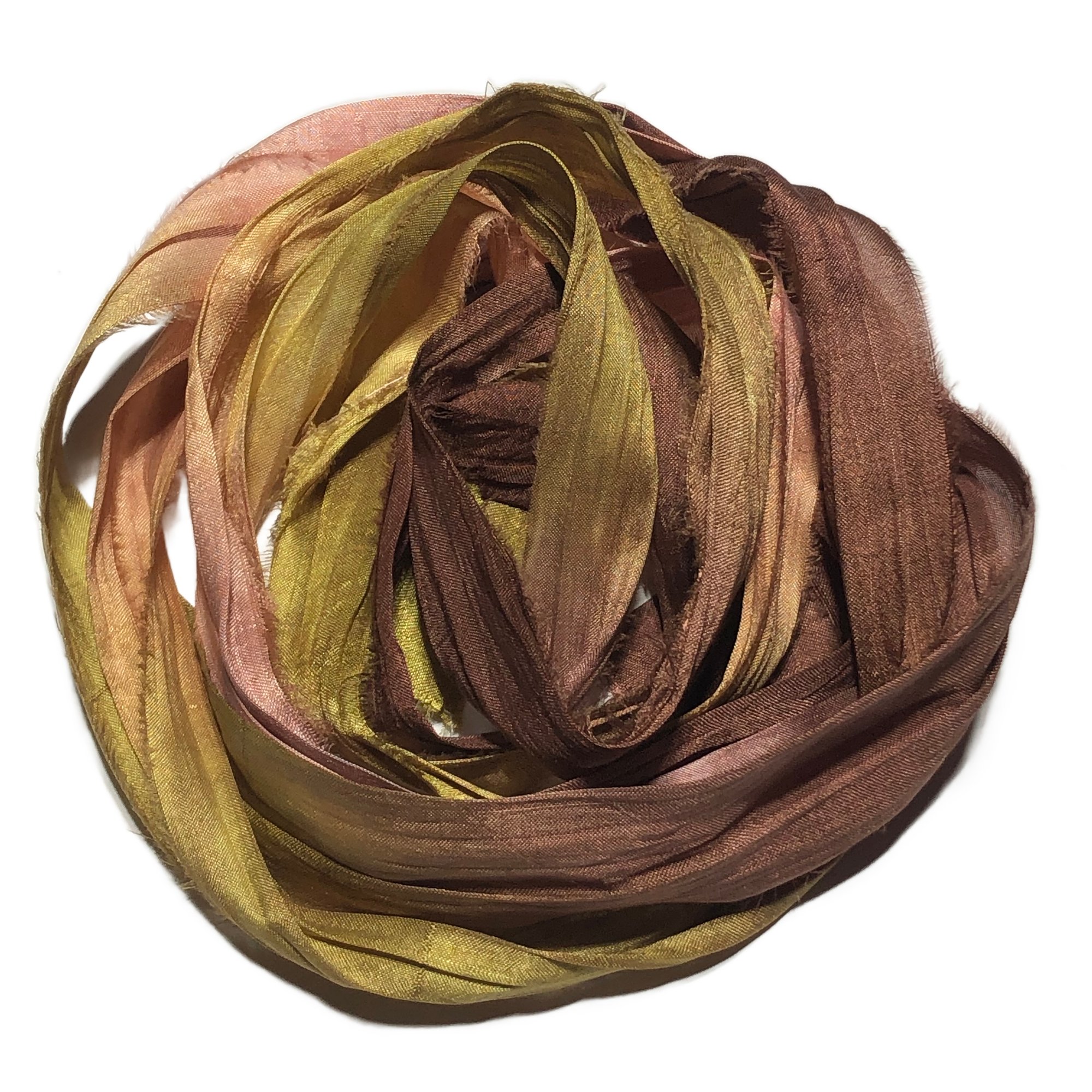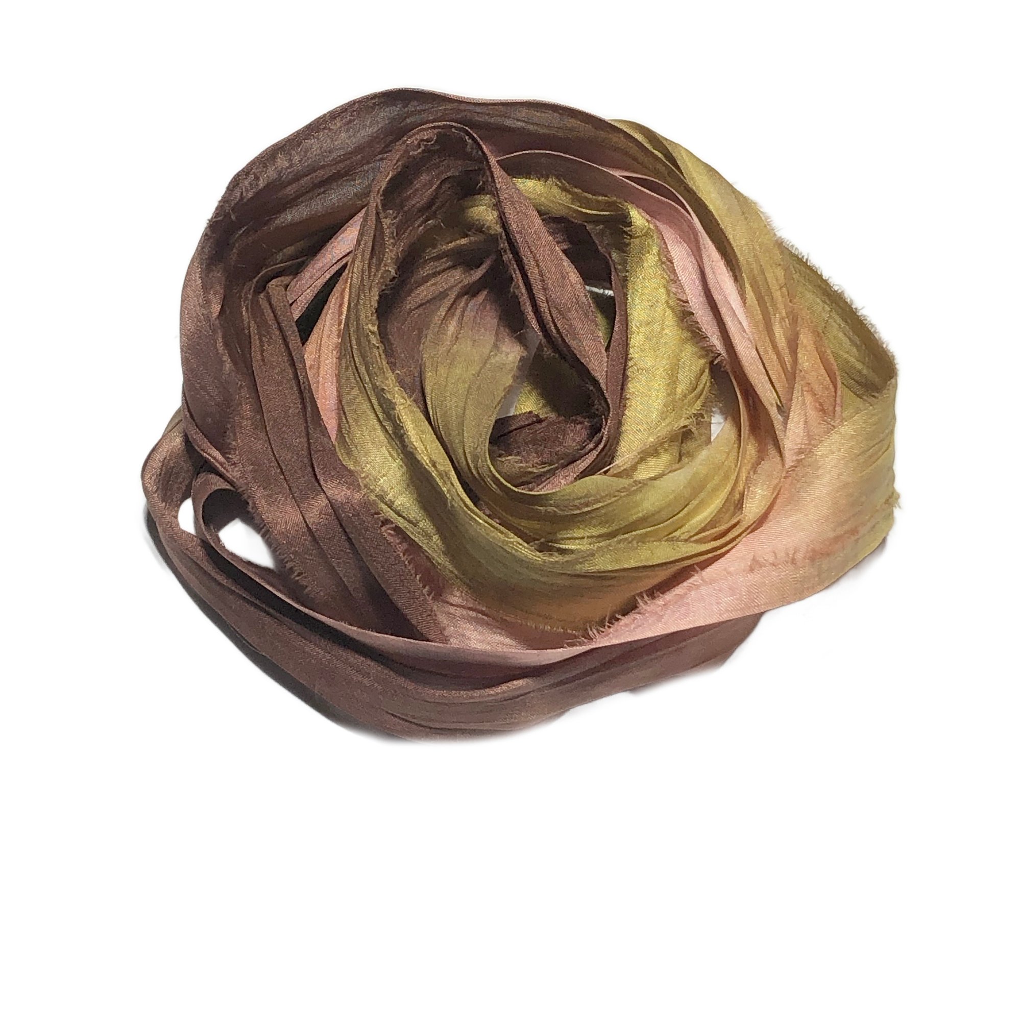 HAND DYED SARI SILK BUNDLES, ARE MADE OF 100% PURE SILK. THIS RECYCLED SILK RIBBON HAS BEEN HAND DYED TO THE BEAUTIFUL SOLIDS OR VARIATED COLOR YOU SEE IN EACH OF OUR UNIQUE BUNDLES.