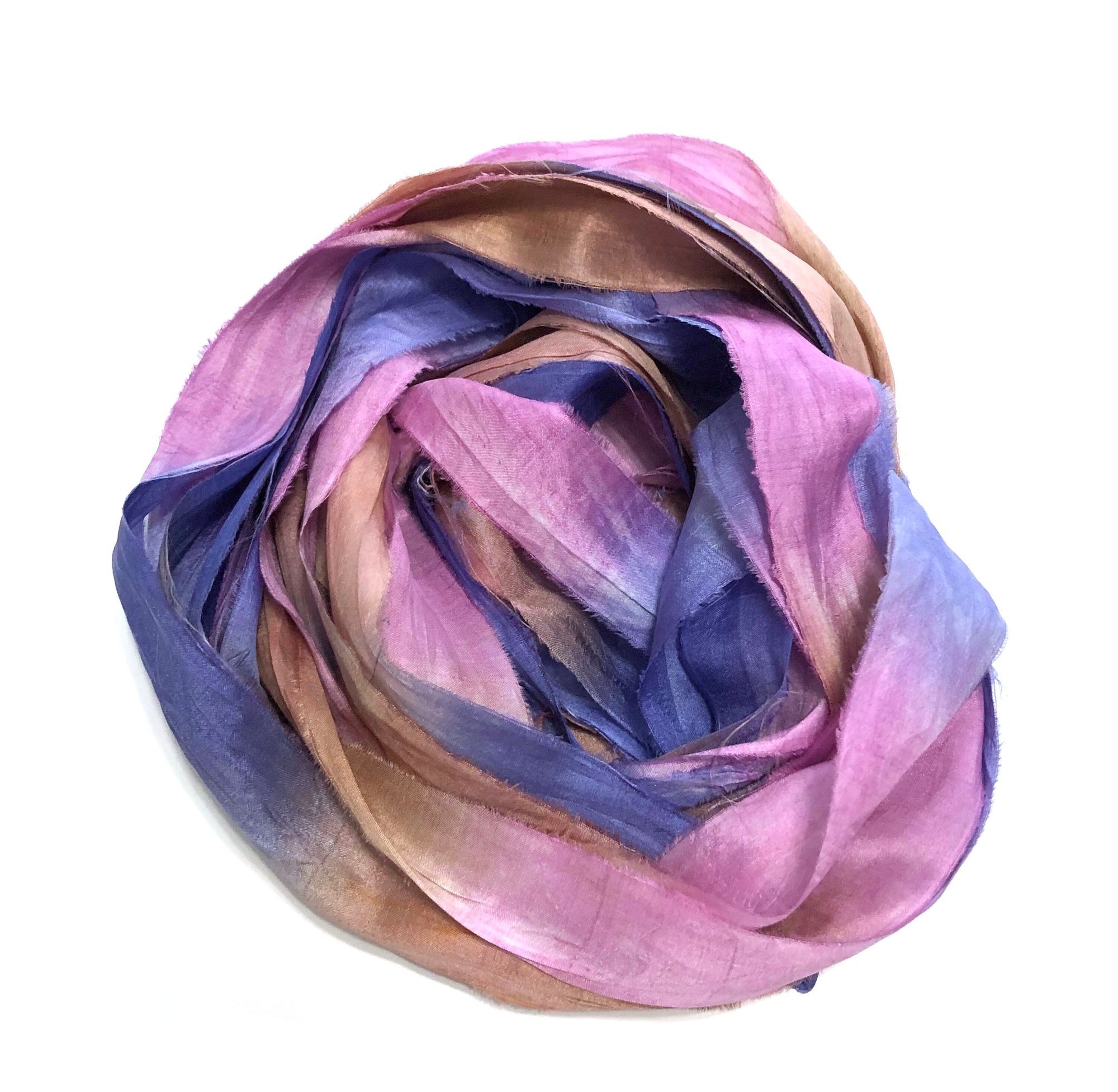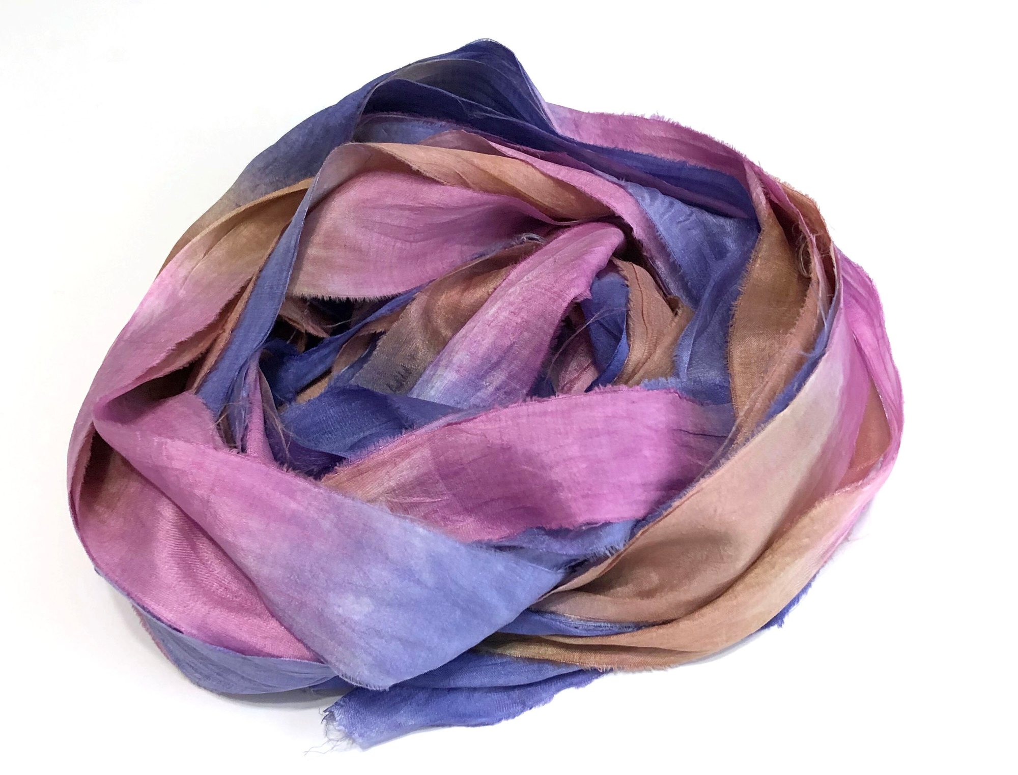 HAND DYED SARI SILK BUNDLES, ARE MADE OF 100% PURE SILK. THIS RECYCLED SILK RIBBON HAS BEEN HAND DYED TO THE BEAUTIFUL SOLIDS OR VARIATED COLOR YOU SEE IN EACH OF OUR UNIQUE BUNDLES.