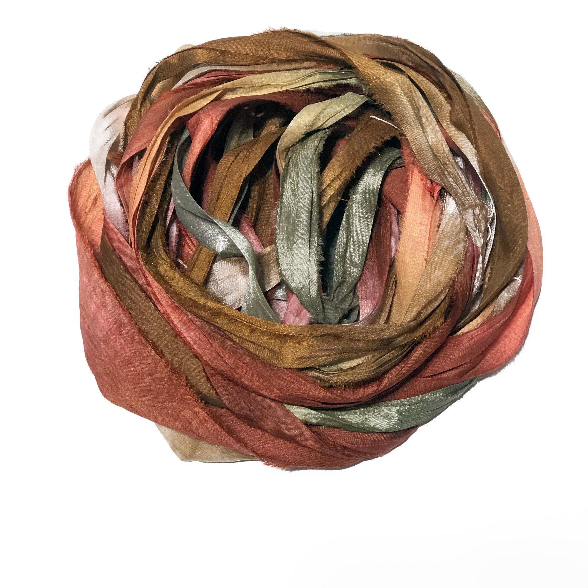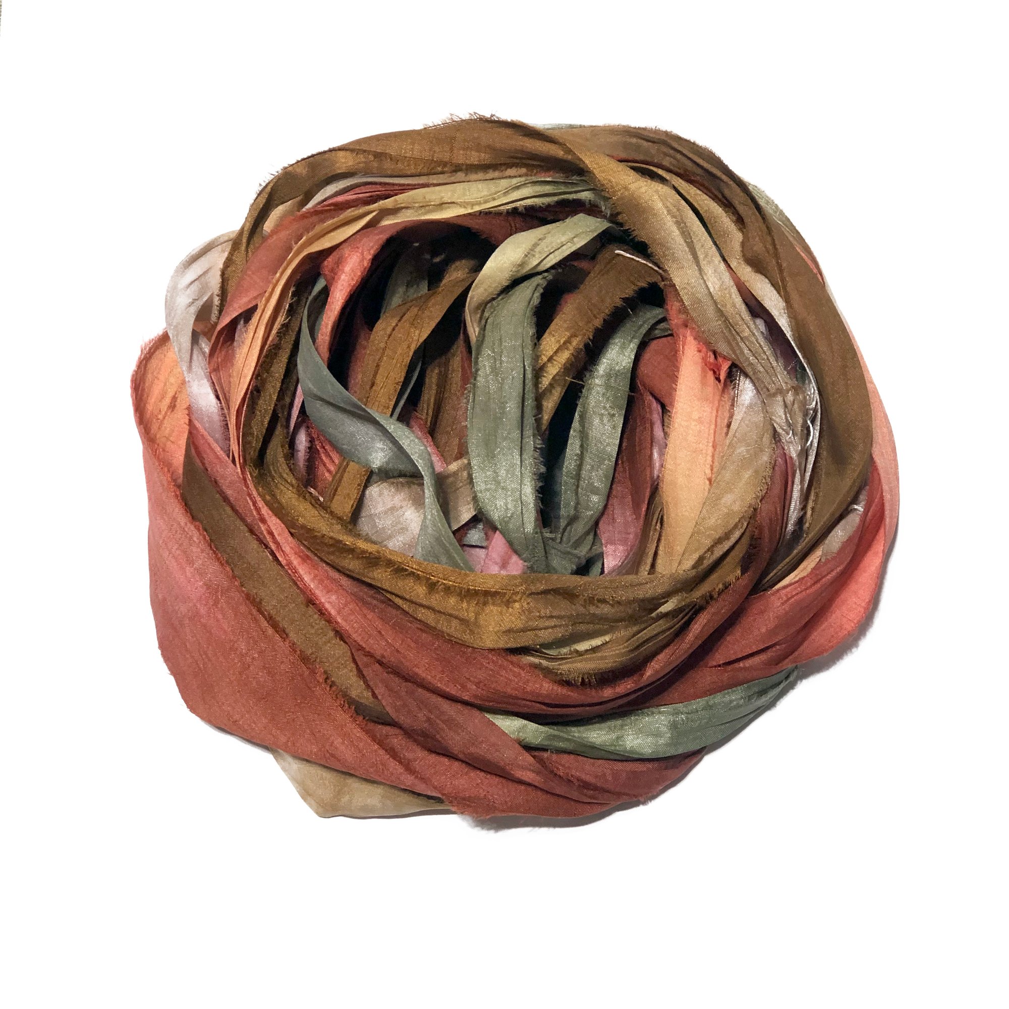 HAND DYED SARI SILK BUNDLES, ARE MADE OF 100% PURE SILK. THIS RECYCLED SILK RIBBON HAS BEEN HAND DYED TO THE BEAUTIFUL SOLIDS OR VARIATED COLOR YOU SEE IN EACH OF OUR UNIQUE BUNDLES.