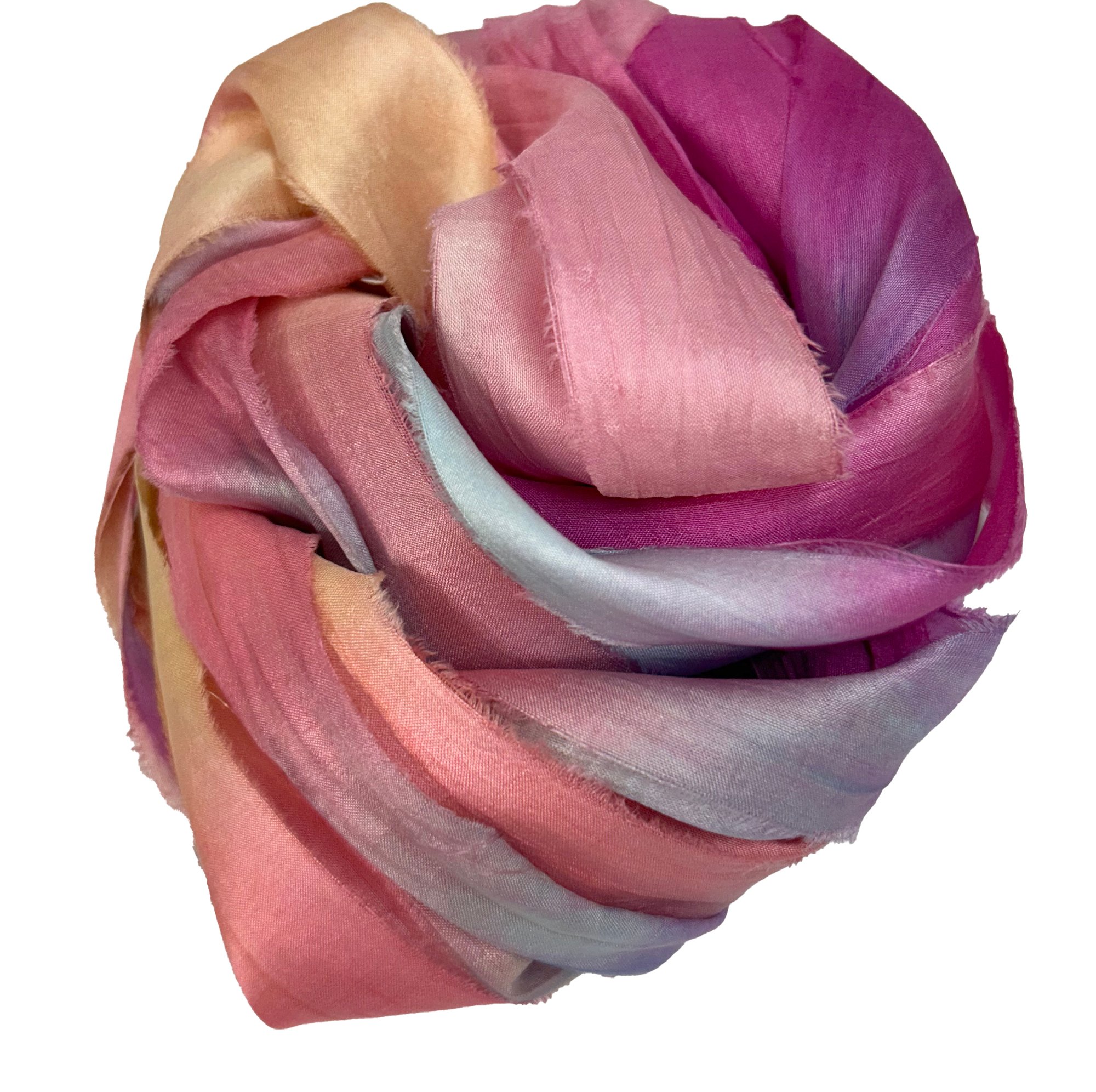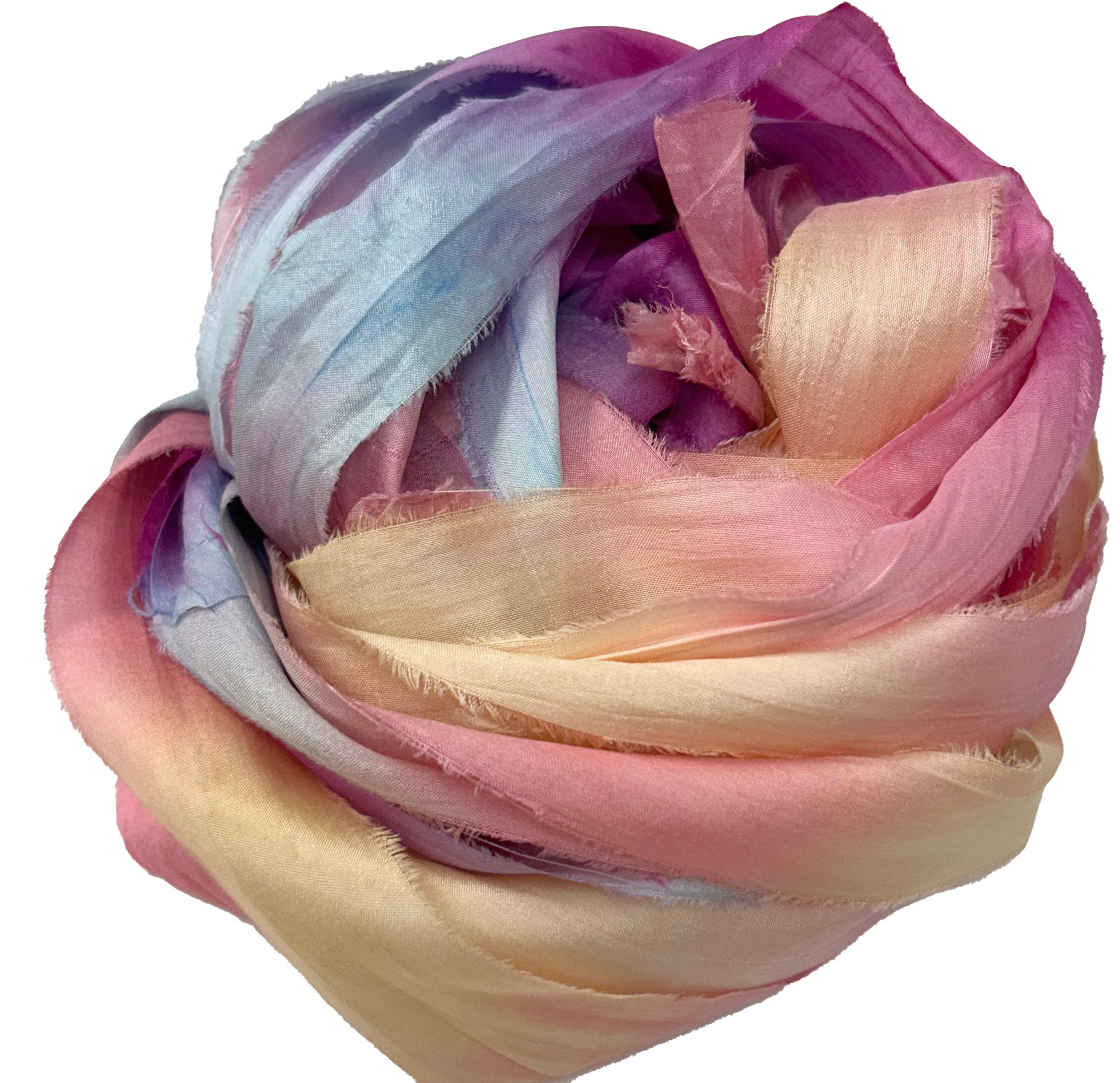 HAND DYED SARI SILK BUNDLES, ARE MADE OF 100% PURE SILK. THIS RECYCLED SILK RIBBON HAS BEEN HAND DYED TO THE BEAUTIFUL SOLIDS OR VARIATED COLOR YOU SEE IN EACH OF OUR UNIQUE BUNDLES.