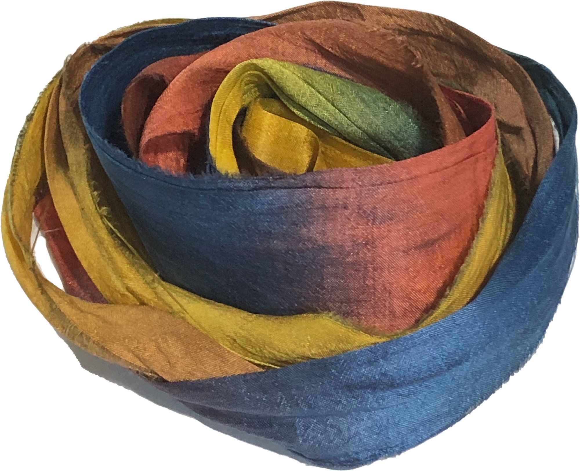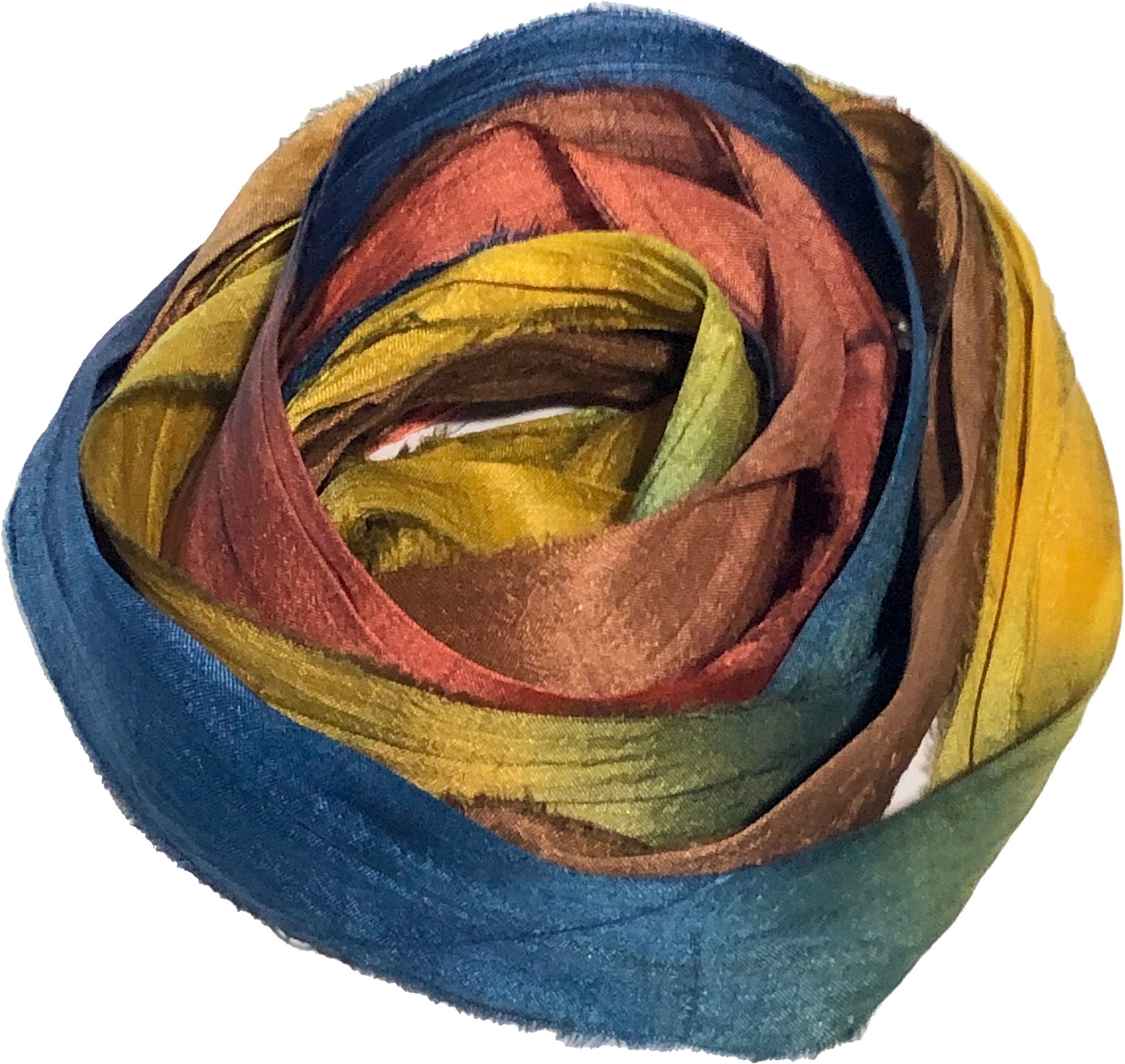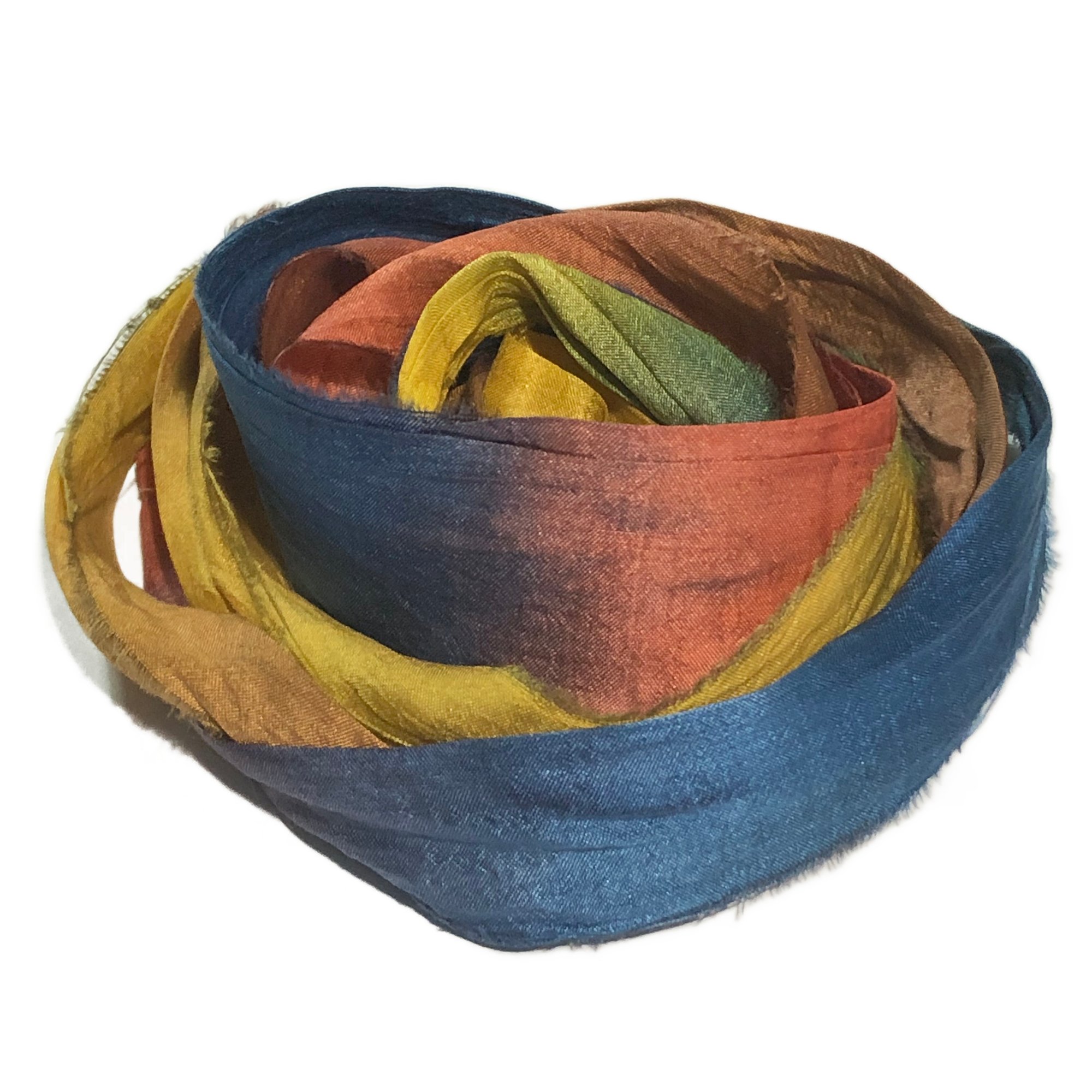 HAND DYED SARI SILK BUNDLES, ARE MADE OF 100% PURE SILK. THIS RECYCLED SILK RIBBON HAS BEEN HAND DYED TO THE BEAUTIFUL SOLIDS OR VARIATED COLOR YOU SEE IN EACH OF OUR UNIQUE BUNDLES.