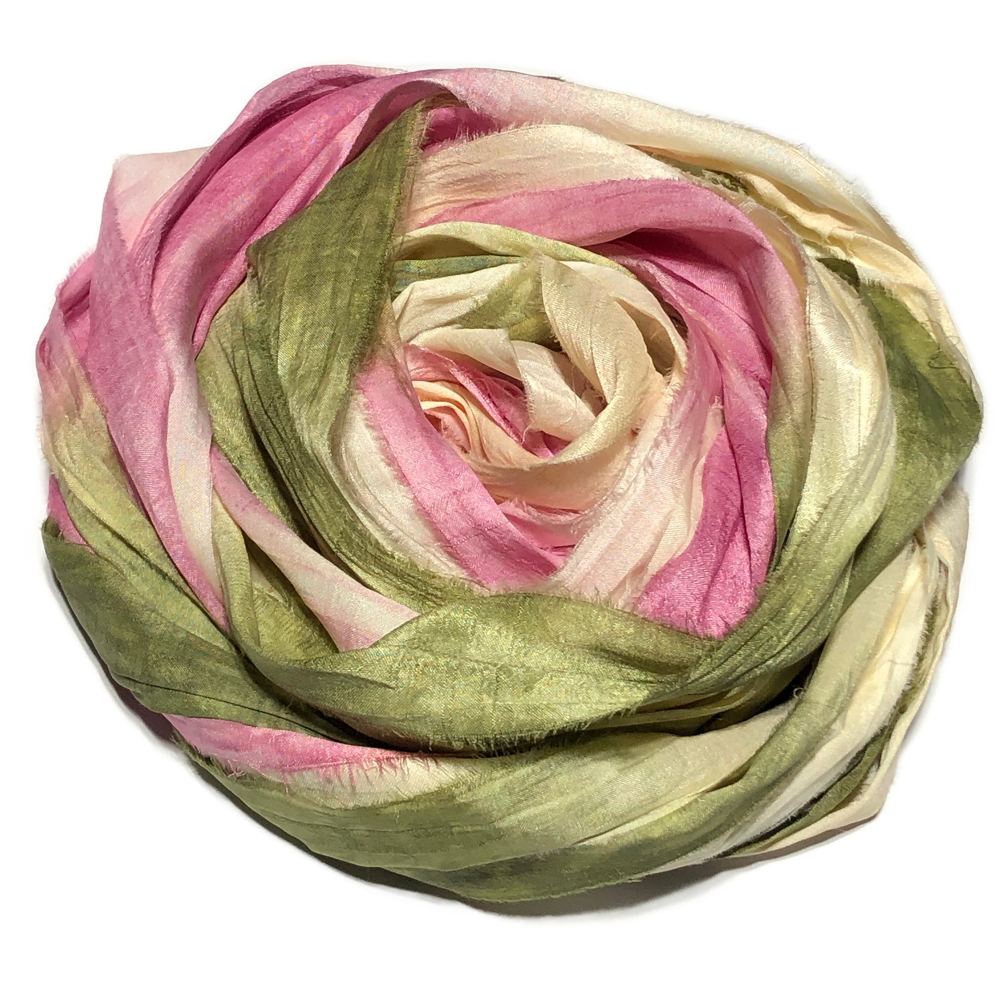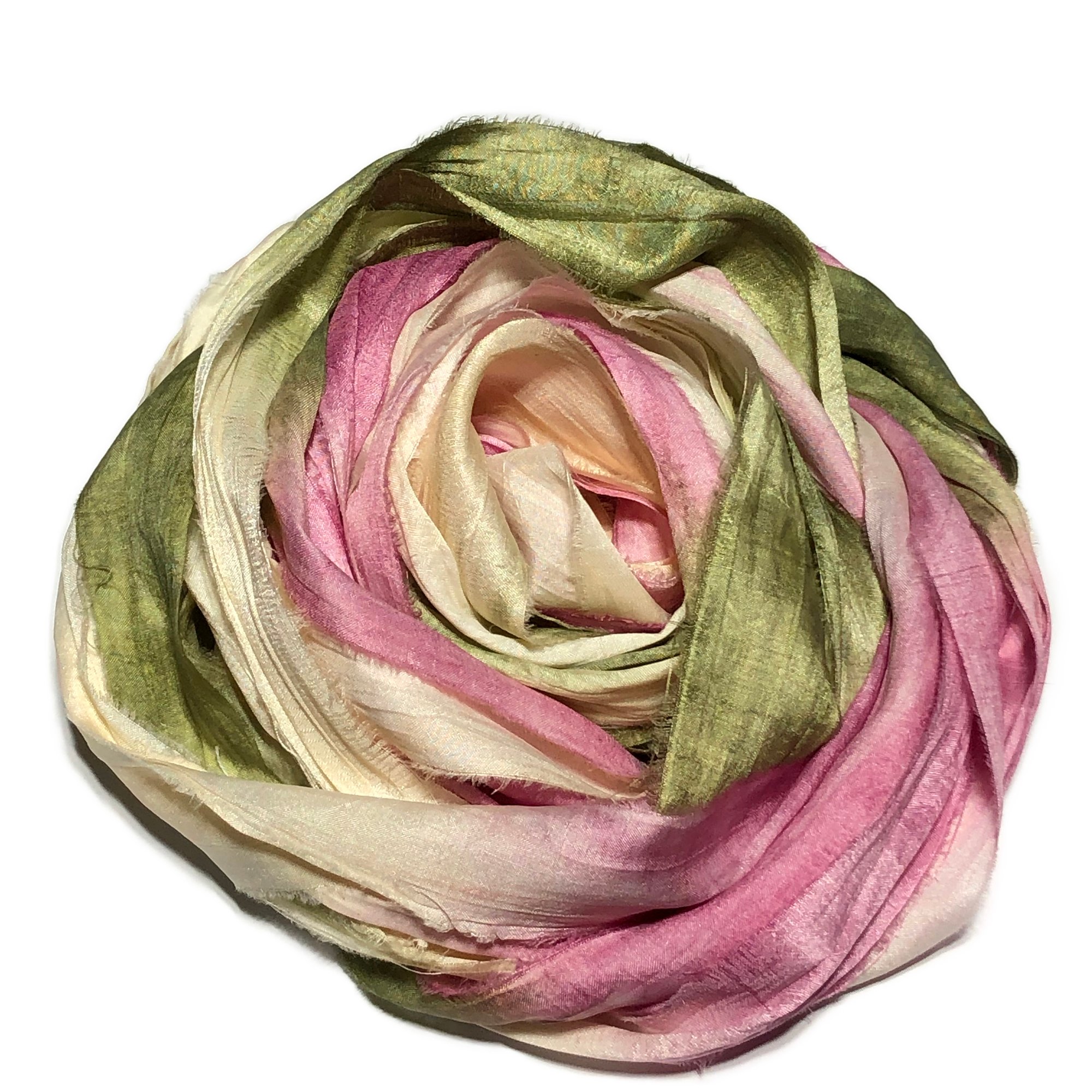 HAND DYED SARI SILK BUNDLES, ARE MADE OF 100% PURE SILK. THIS RECYCLED SILK RIBBON HAS BEEN HAND DYED TO THE BEAUTIFUL SOLIDS OR VARIATED COLOR YOU SEE IN EACH OF OUR UNIQUE BUNDLES.