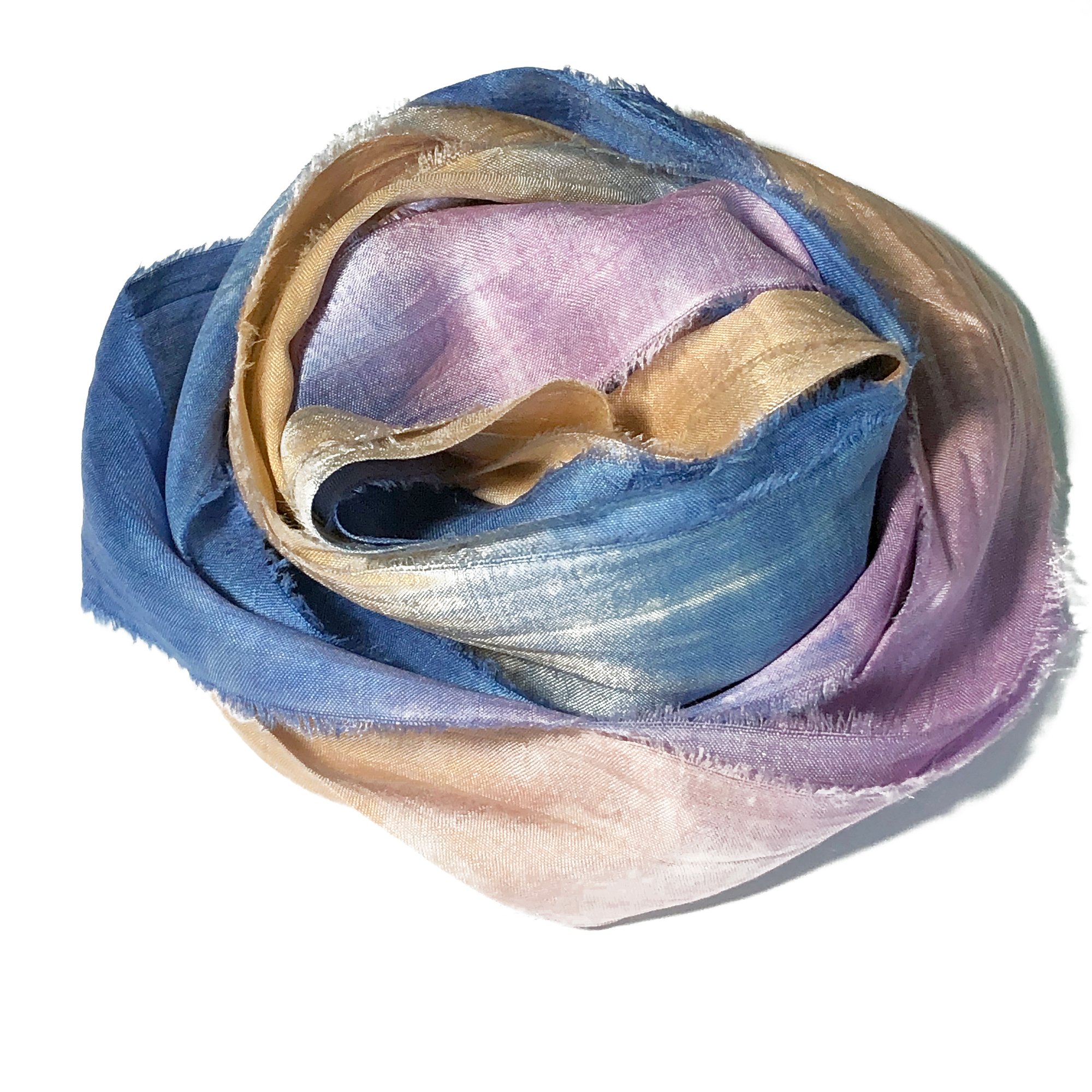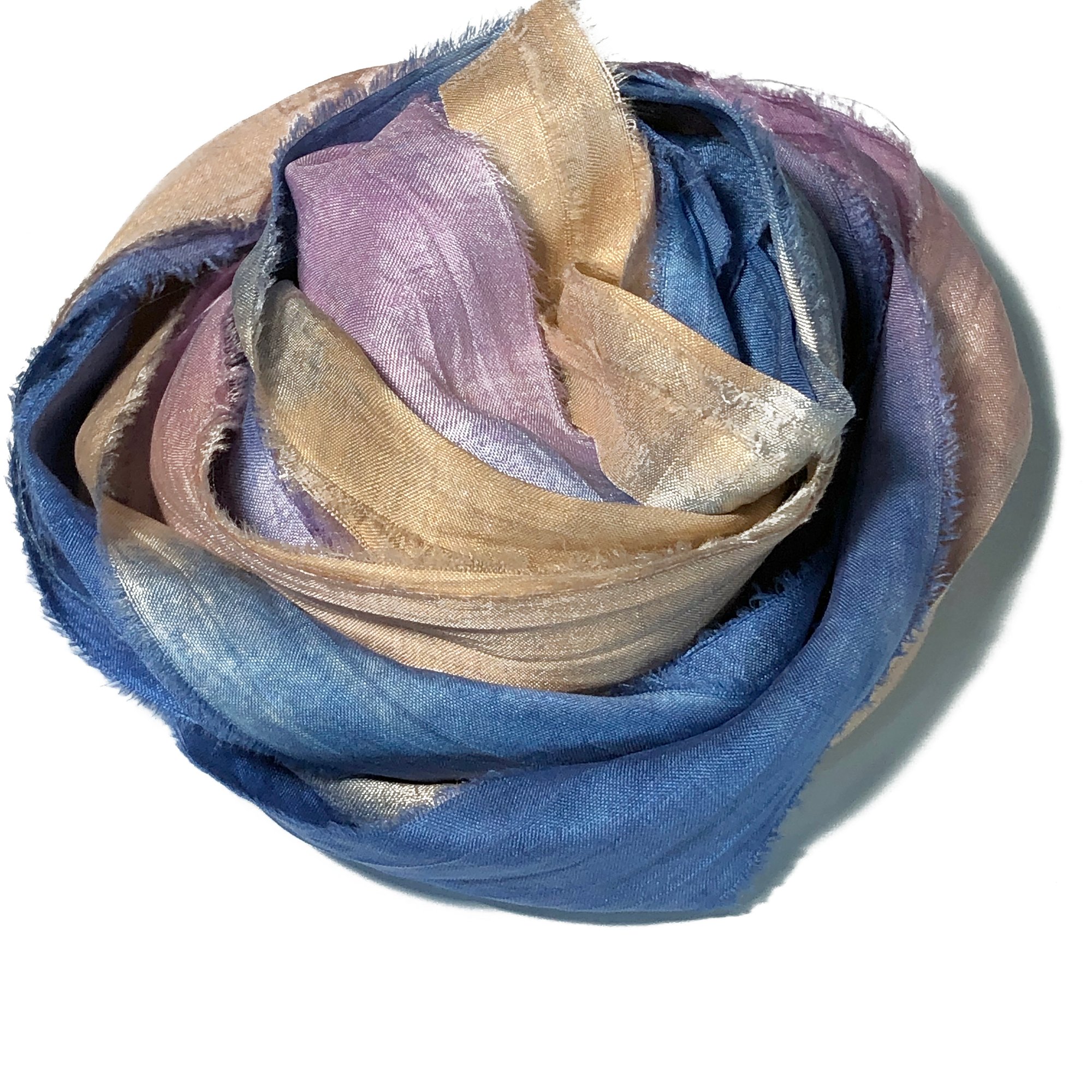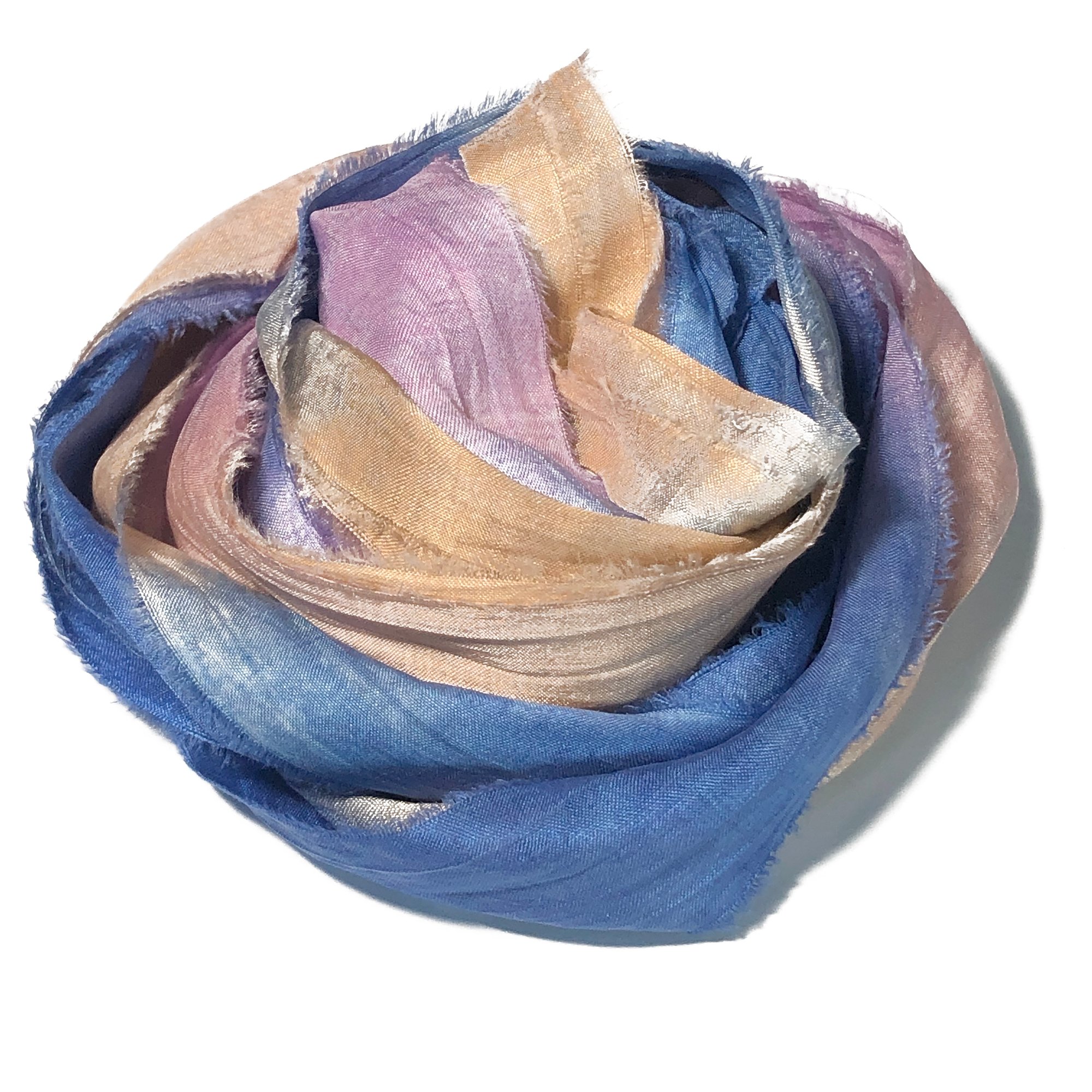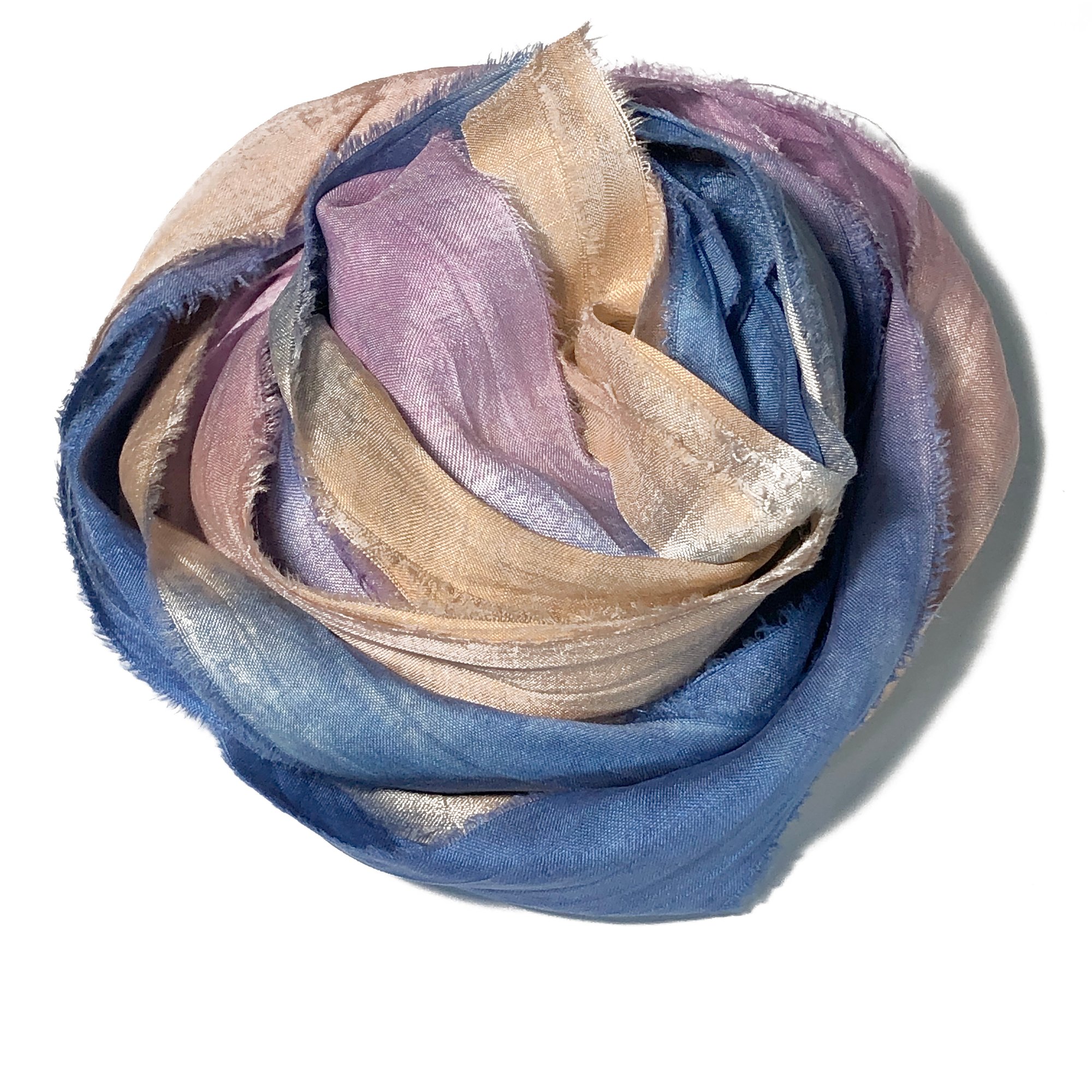 HAND DYED SARI SILK BUNDLES, ARE MADE OF 100% PURE SILK. THIS RECYCLED SILK RIBBON HAS BEEN HAND DYED TO THE BEAUTIFUL SOLIDS OR VARIATED COLOR YOU SEE IN EACH OF OUR UNIQUE BUNDLES.
