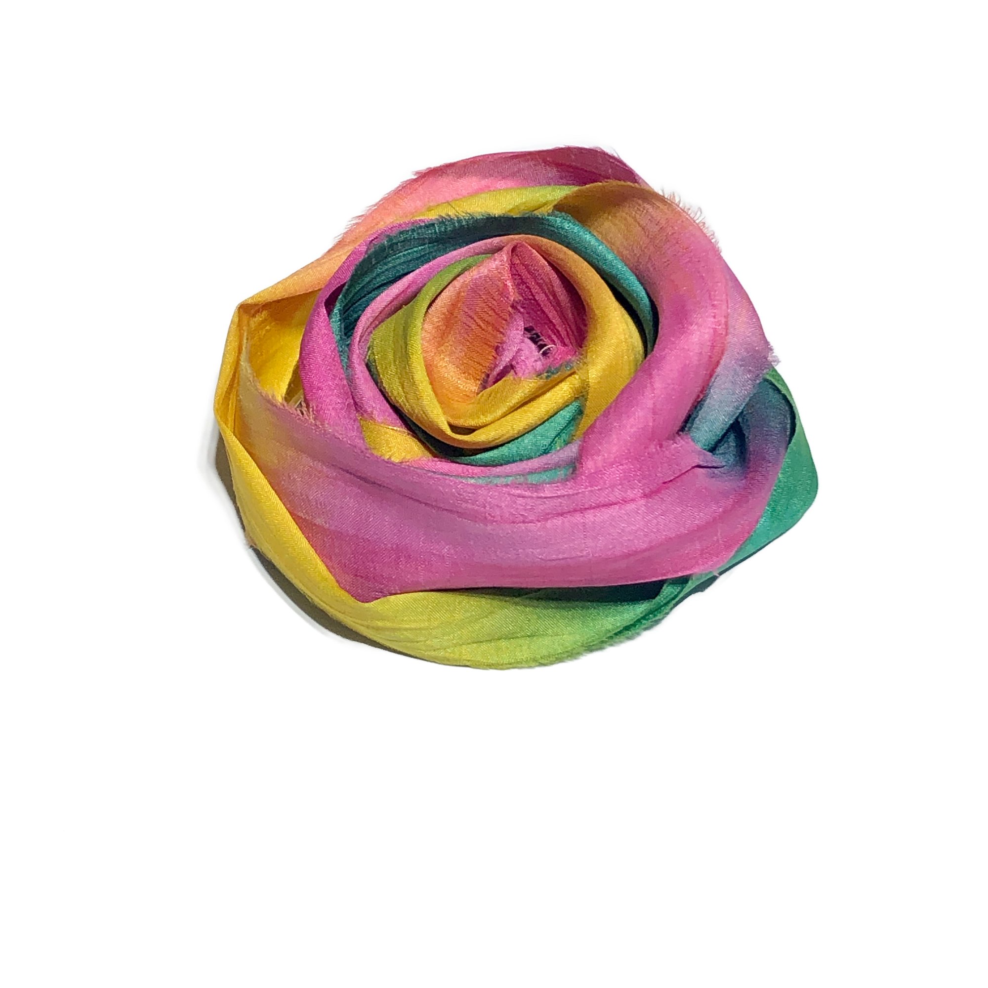 HAND DYED SARI SILK BUNDLES, ARE MADE OF 100% PURE SILK. THIS RECYCLED SILK RIBBON HAS BEEN HAND DYED TO THE BEAUTIFUL SOLIDS OR VARIATED COLOR YOU SEE IN EACH OF OUR UNIQUE BUNDLES.
