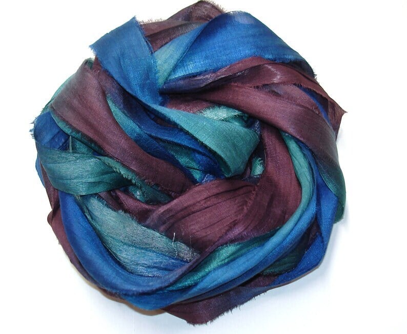 HAND DYED SARI SILK BUNDLES, ARE MADE OF 100% PURE SILK. THIS RECYCLED SILK RIBBON HAS BEEN HAND DYED TO THE BEAUTIFUL SOLIDS OR VARIATED COLOR YOU SEE IN EACH OF OUR UNIQUE BUNDLES.