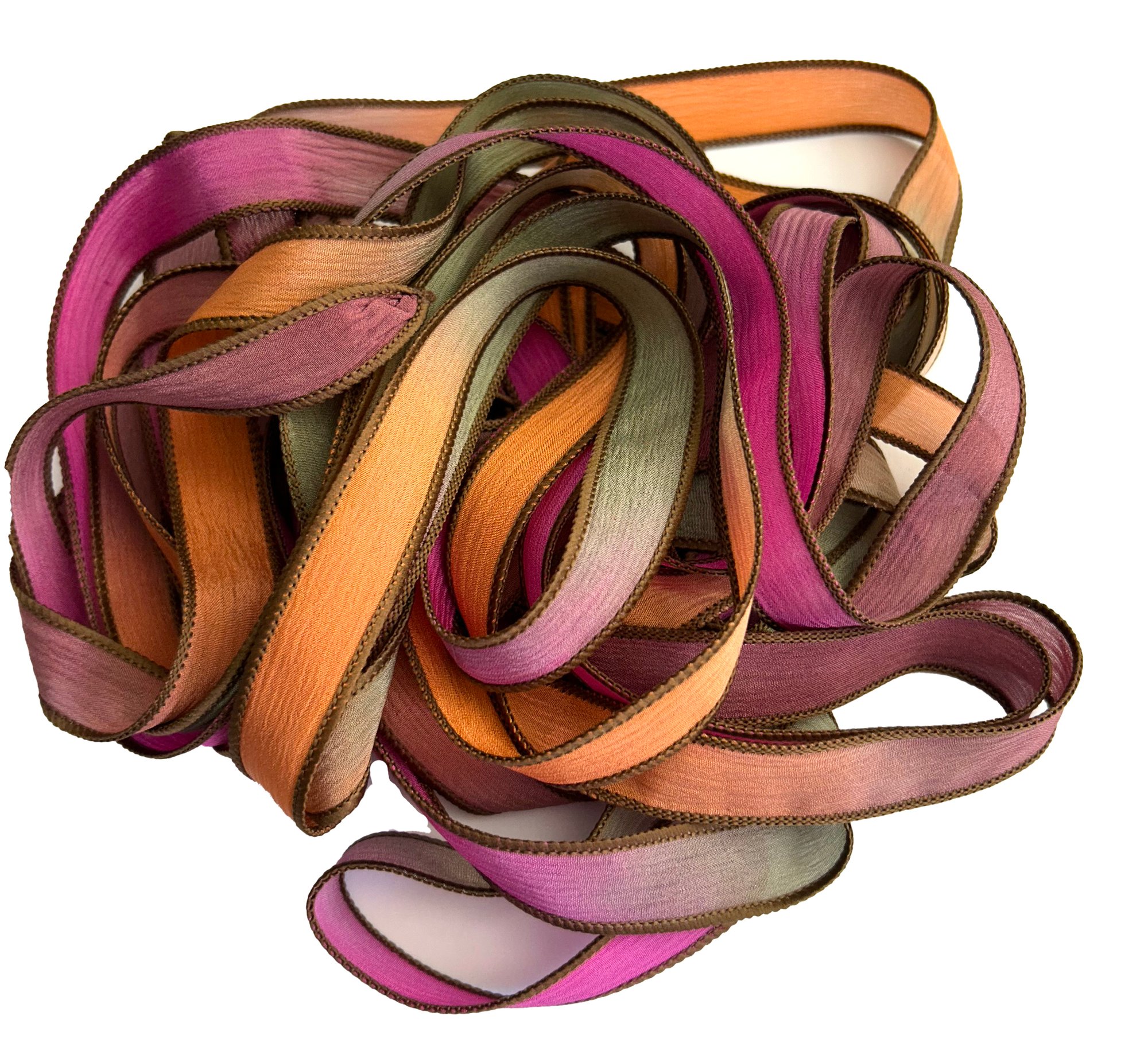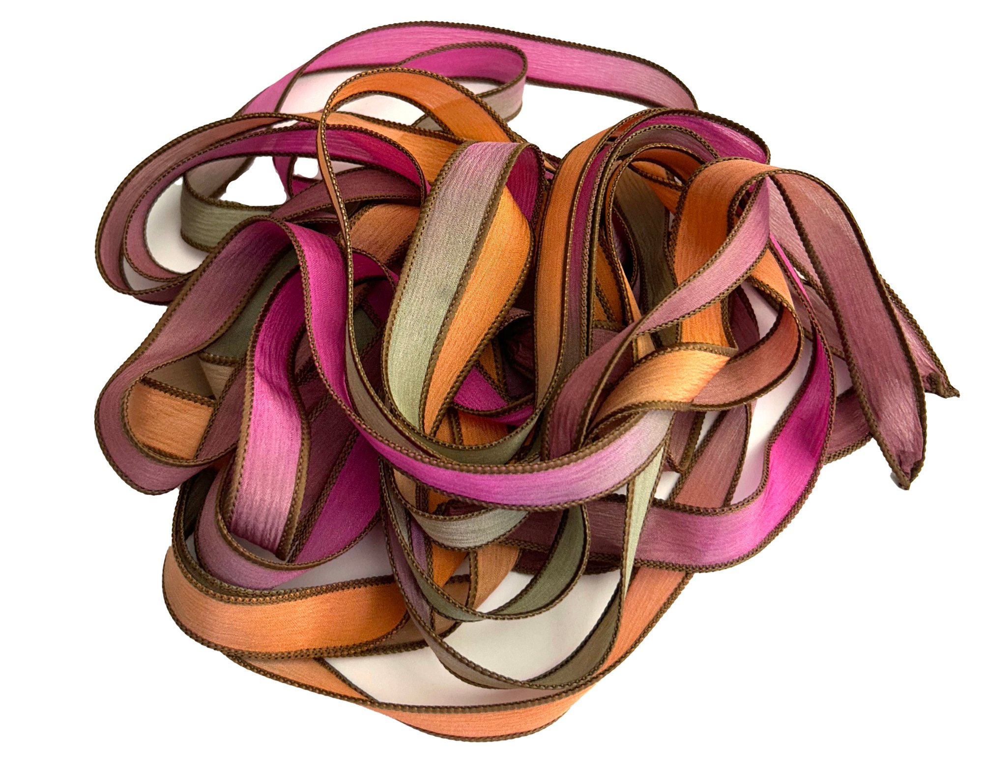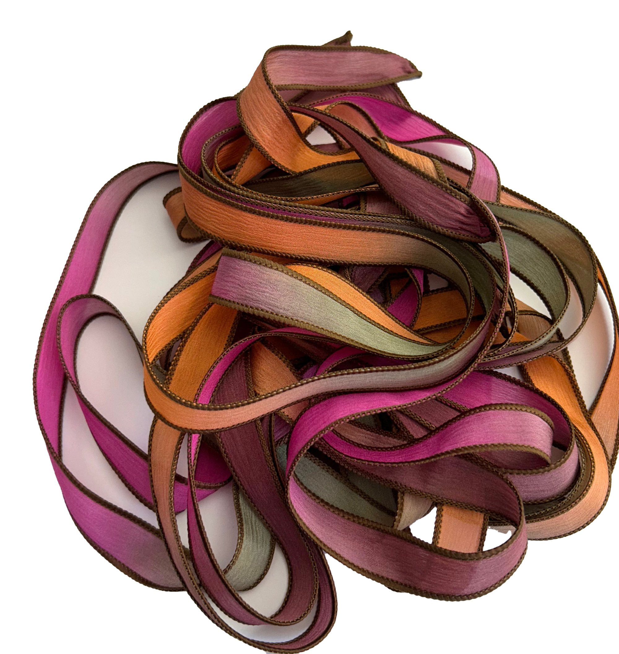 HAND DYED RIBBONS CAN APPEAR LIGHTER OR DARKER IN PERSON. SLIGHT VARIATIONS MAY OCCUR FROM ONE DYE LOT TO ANOTHER.