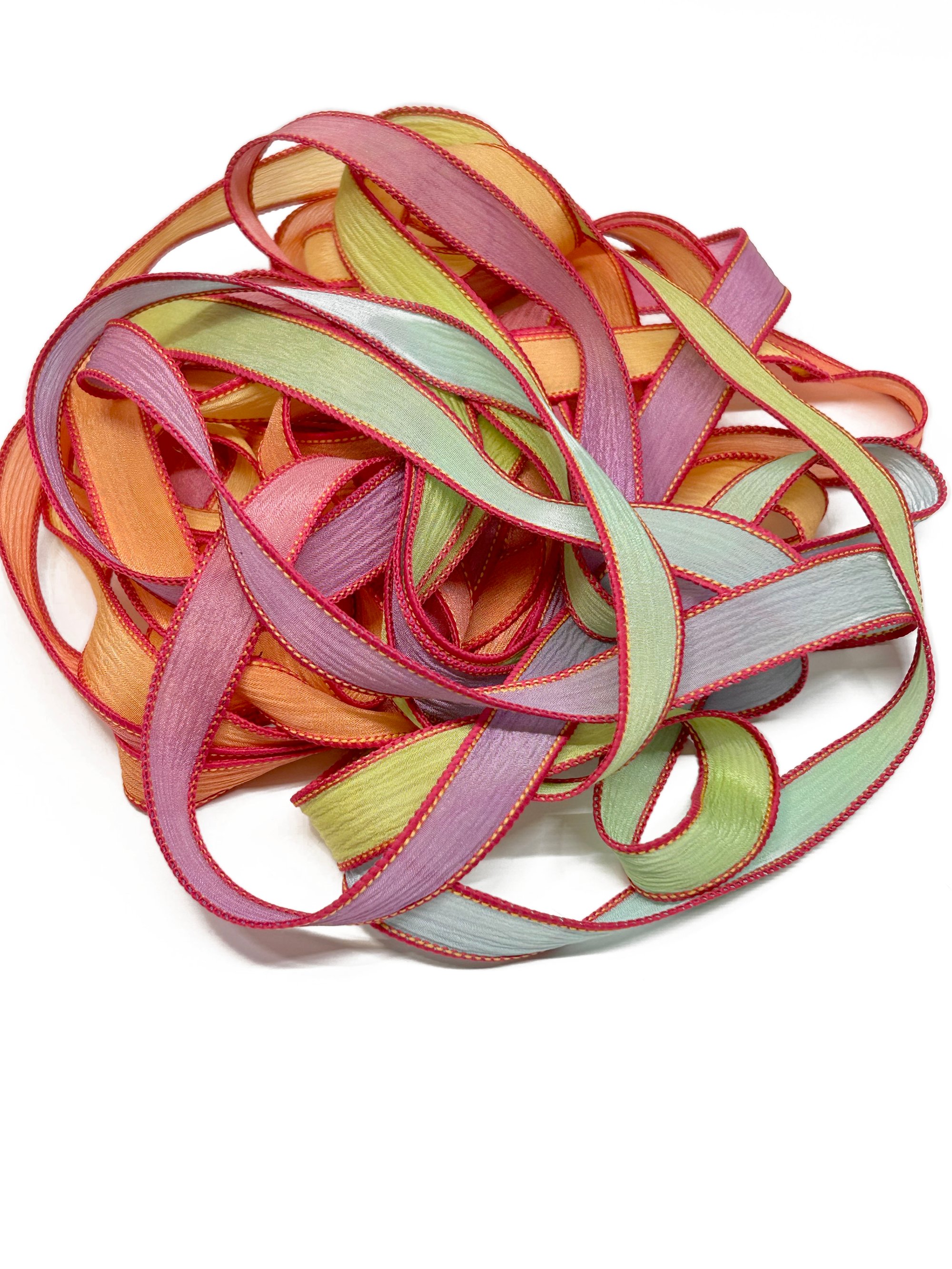 HAND DYED RIBBONS CAN APPEAR LIGHTER OR DARKER IN PERSON. SLIGHT VARIATIONS MAY OCCUR FROM ONE DYE LOT TO ANOTHER.