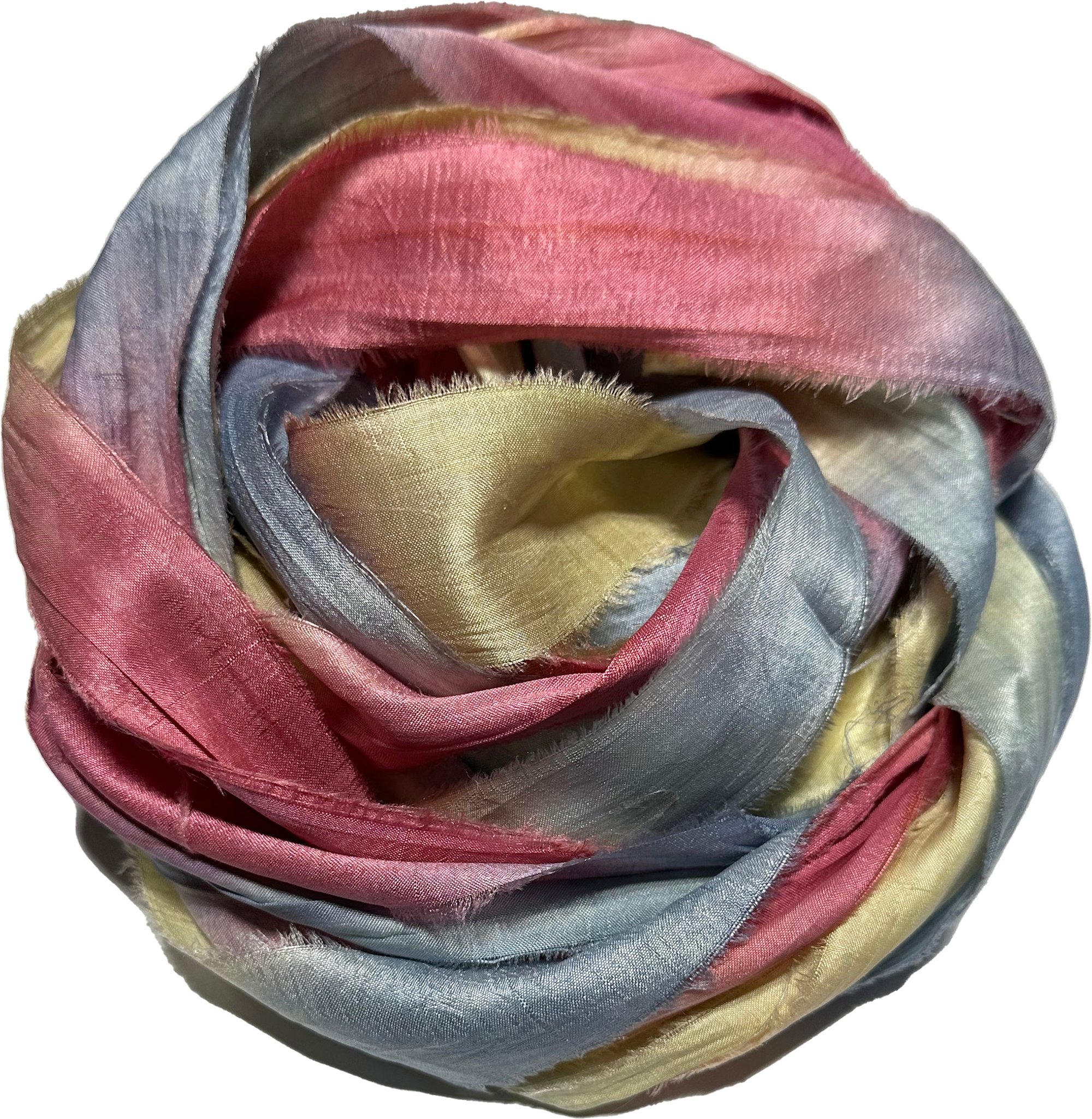 HAND DYED SARI SILK BUNDLES, ARE MADE OF 100% PURE SILK. THIS RECYCLED SILK RIBBON HAS BEEN HAND DYED TO THE BEAUTIFUL SOLIDS OR VARIATED COLOR YOU SEE IN EACH OF OUR UNIQUE BUNDLES.