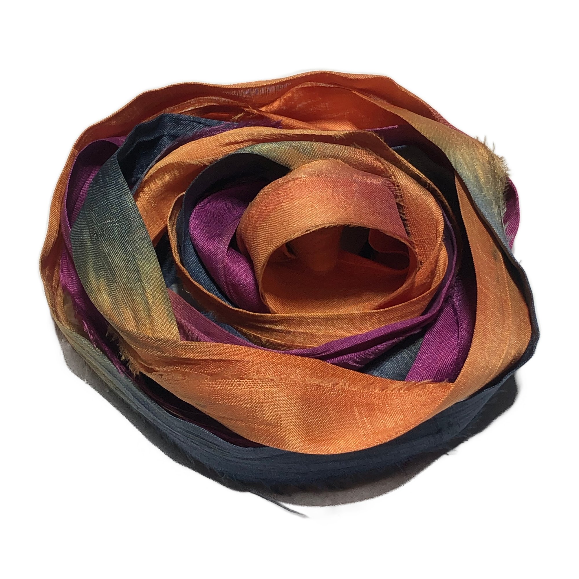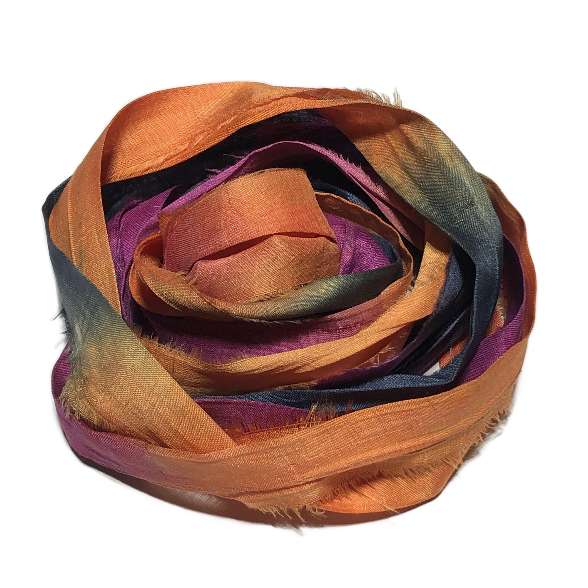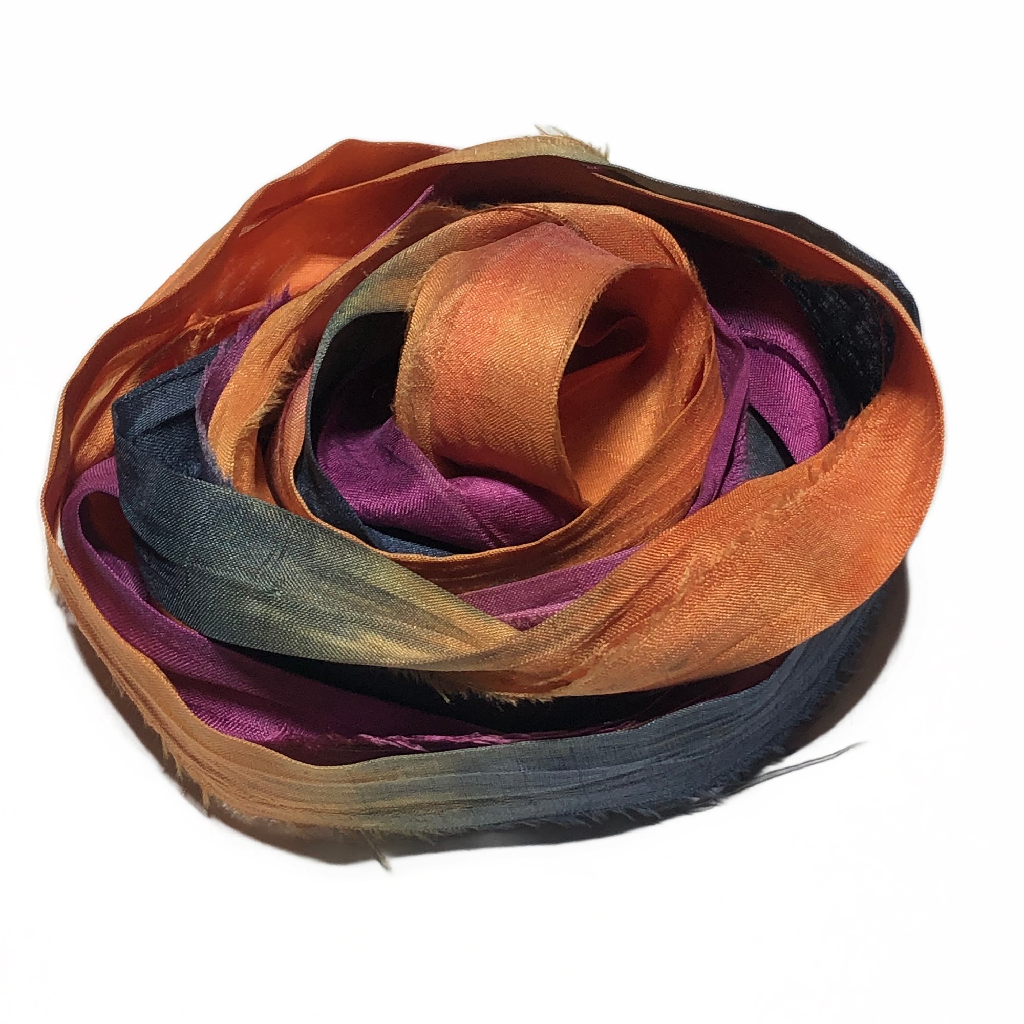HAND DYED SARI SILK BUNDLES, ARE MADE OF 100% PURE SILK. THIS RECYCLED SILK RIBBON HAS BEEN HAND DYED TO THE BEAUTIFUL SOLIDS OR VARIATED COLOR YOU SEE IN EACH OF OUR UNIQUE BUNDLES.