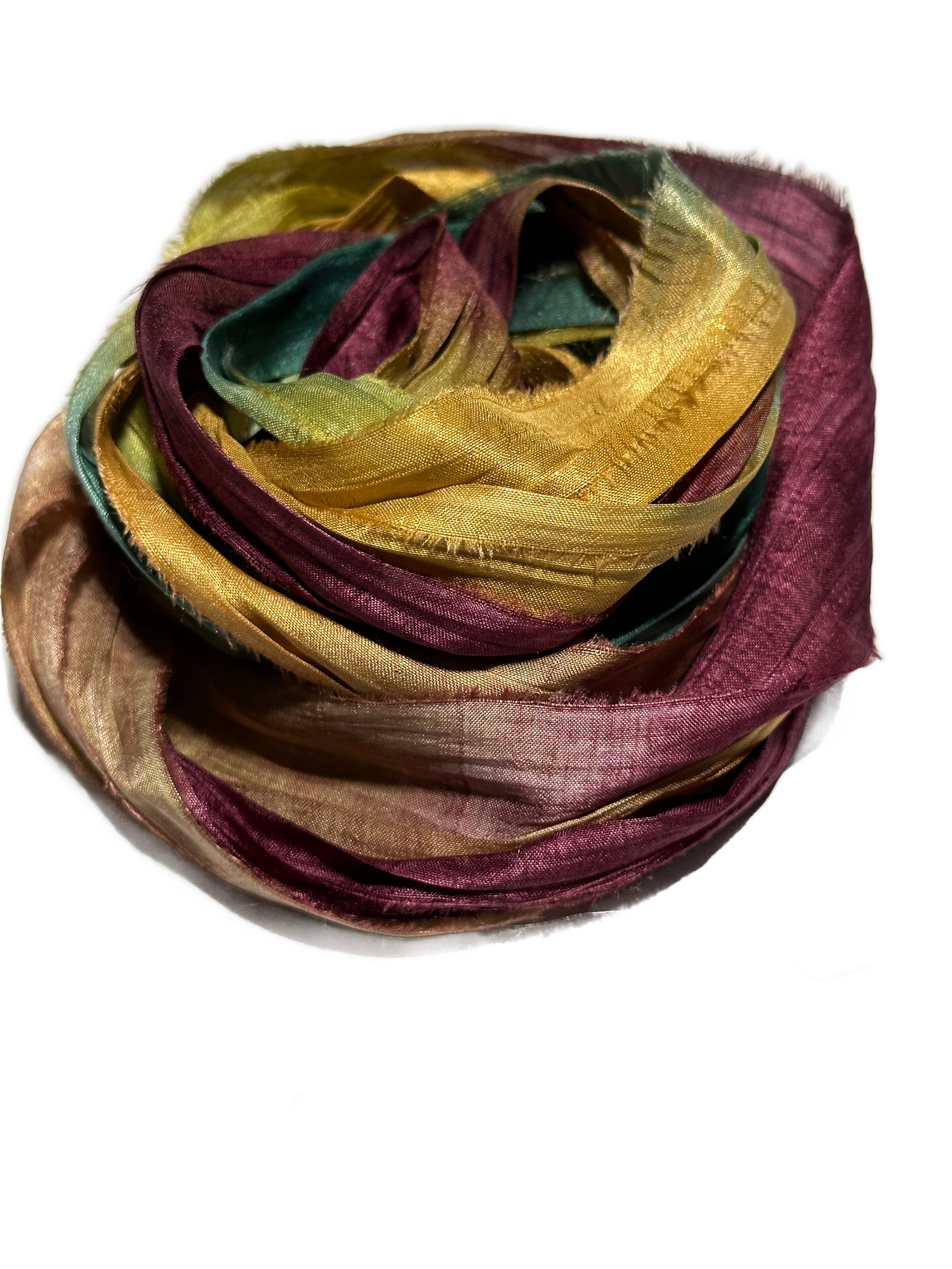 HAND DYED SARI SILK BUNDLES, ARE MADE OF 100% PURE SILK. THIS RECYCLED SILK RIBBON HAS BEEN HAND DYED TO THE BEAUTIFUL SOLIDS OR VARIATED COLOR YOU SEE IN EACH OF OUR UNIQUE BUNDLES.