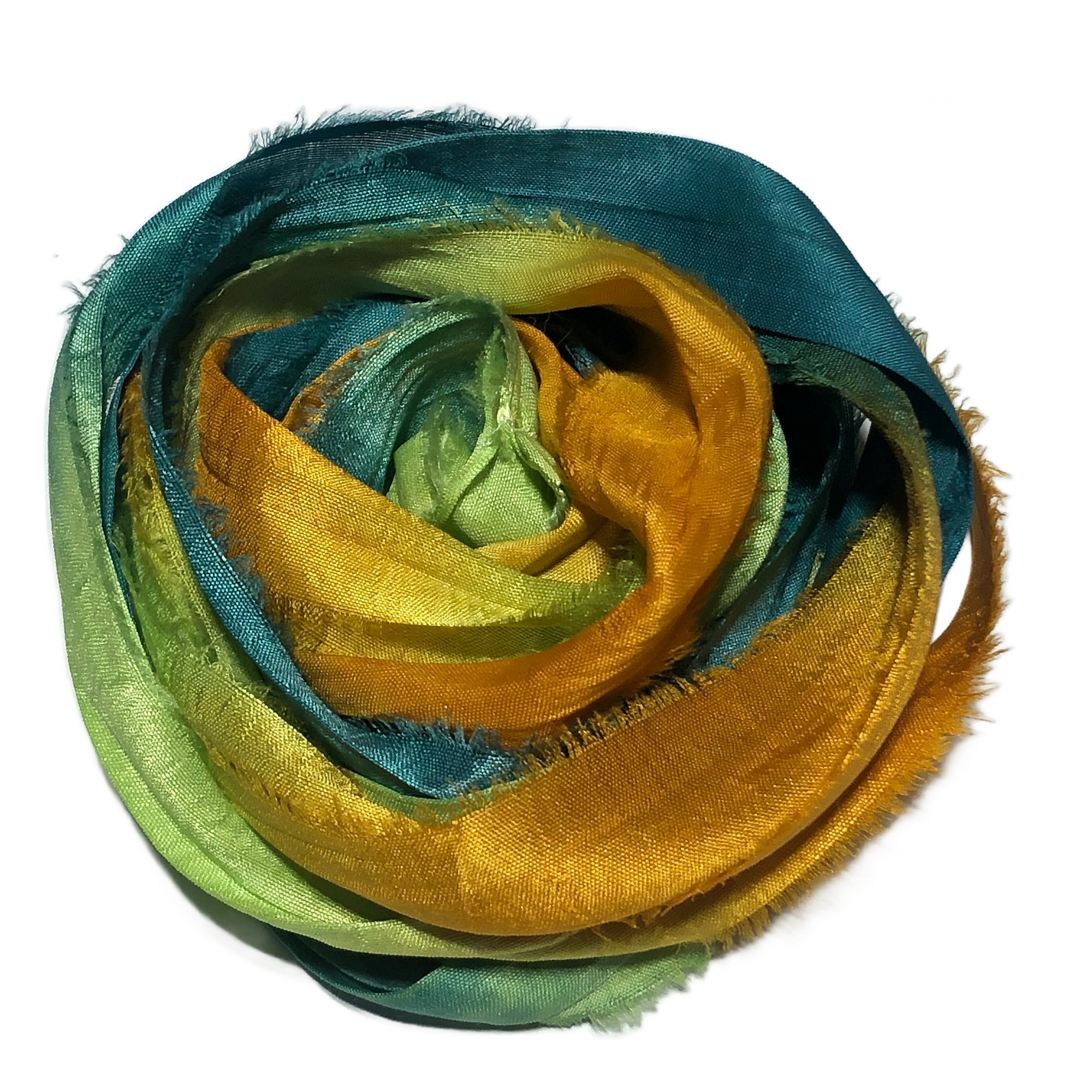 HAND DYED SARI SILK BUNDLES, ARE MADE OF 100% PURE SILK. THIS RECYCLED SILK RIBBON HAS BEEN HAND DYED TO THE BEAUTIFUL SOLIDS OR VARIATED COLOR YOU SEE IN EACH OF OUR UNIQUE BUNDLES.