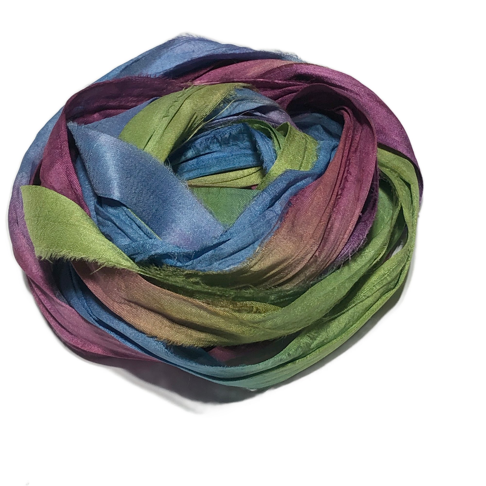 HAND DYED SARI SILK BUNDLES, ARE MADE OF 100% PURE SILK. THIS RECYCLED SILK RIBBON HAS BEEN HAND DYED TO THE BEAUTIFUL SOLIDS OR VARIATED COLOR YOU SEE IN EACH OF OUR UNIQUE BUNDLES.