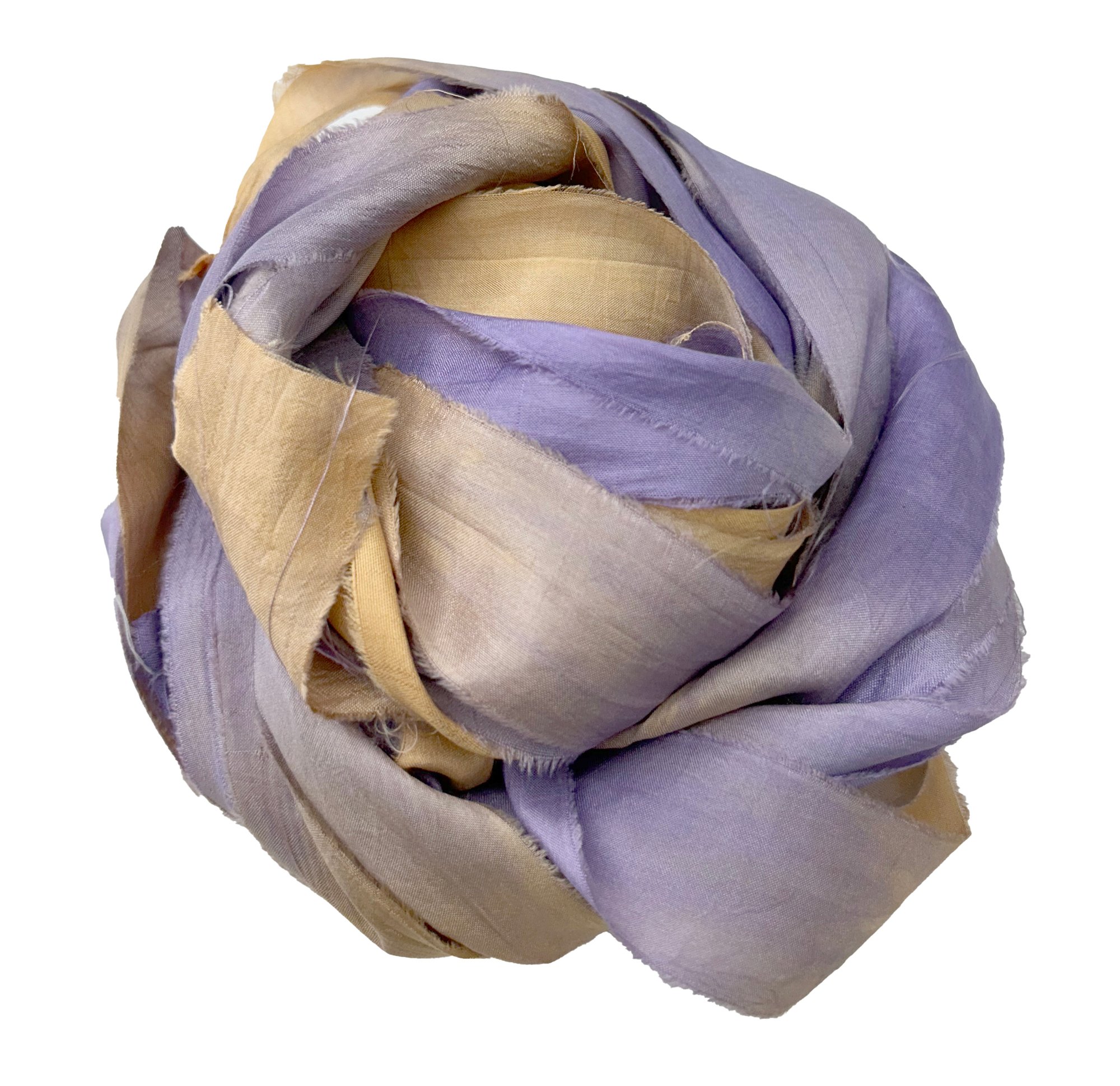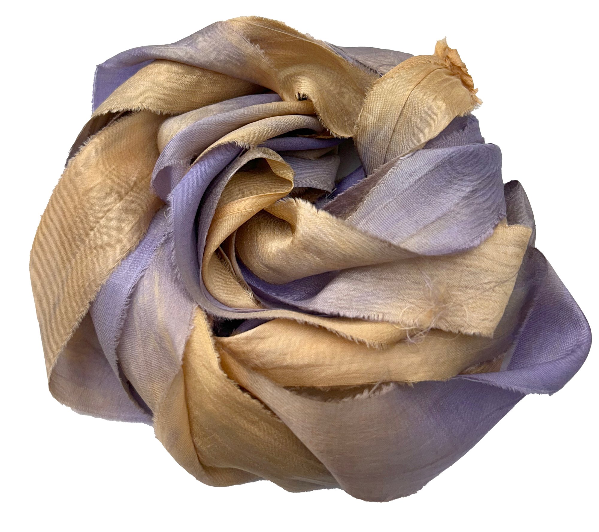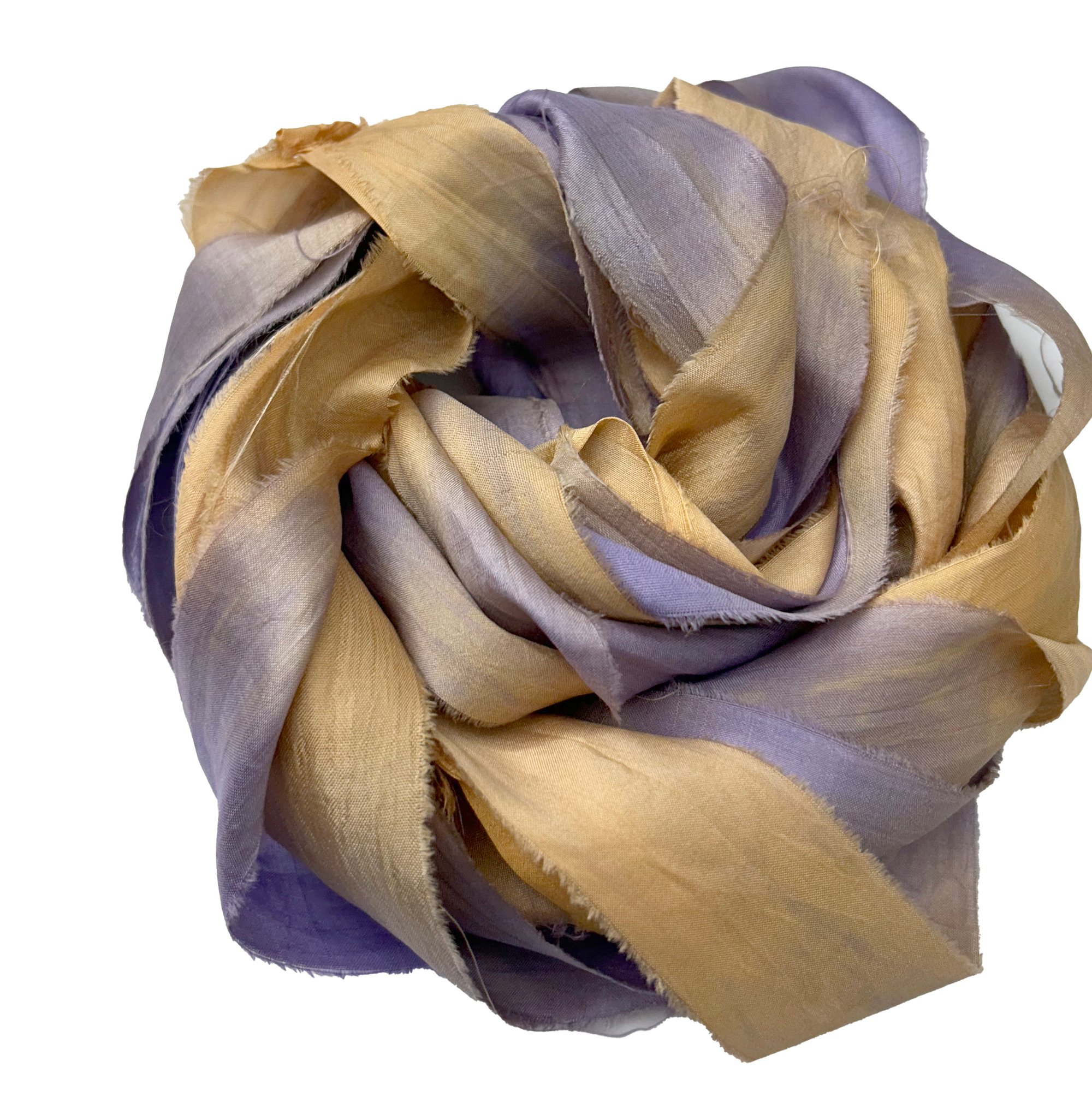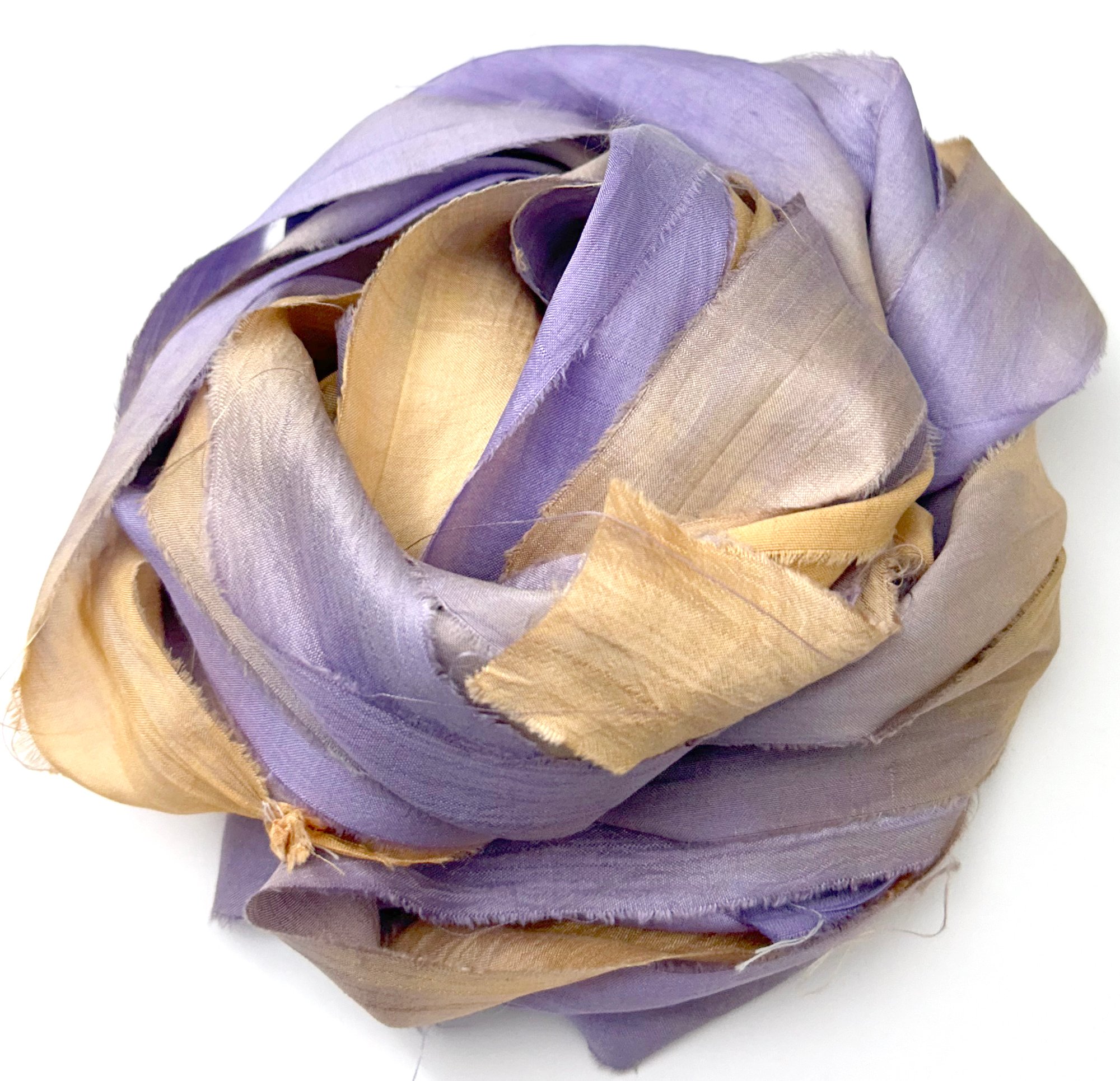 HAND DYED SARI SILK BUNDLES, ARE MADE OF 100% PURE SILK. THIS RECYCLED SILK RIBBON HAS BEEN HAND DYED TO THE BEAUTIFUL SOLIDS OR VARIATED COLOR YOU SEE IN EACH OF OUR UNIQUE BUNDLES.