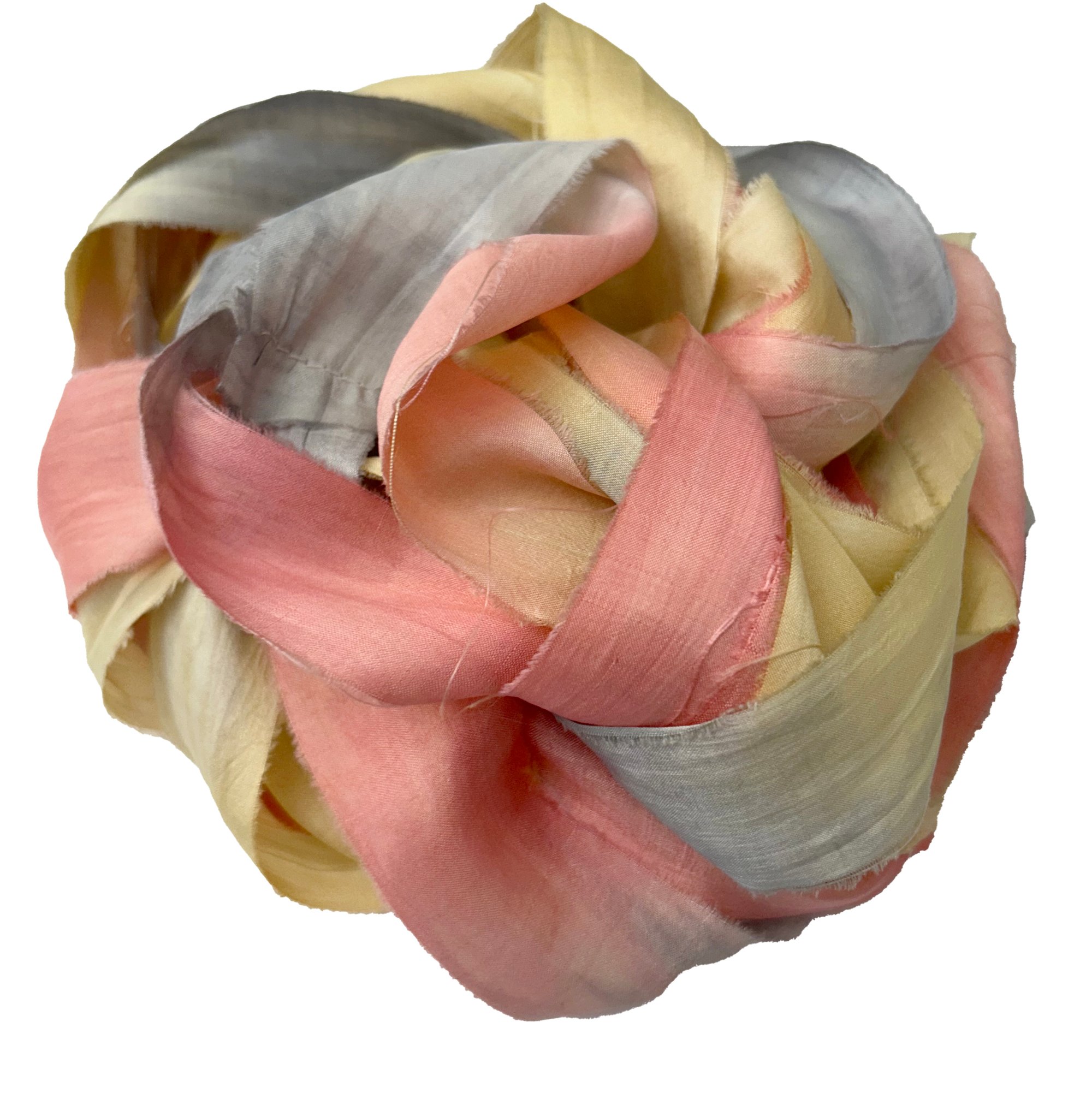 HAND DYED SARI SILK BUNDLES, ARE MADE OF 100% PURE SILK. THIS RECYCLED SILK RIBBON HAS BEEN HAND DYED TO THE BEAUTIFUL SOLIDS OR VARIATED COLOR YOU SEE IN EACH OF OUR UNIQUE BUNDLES.