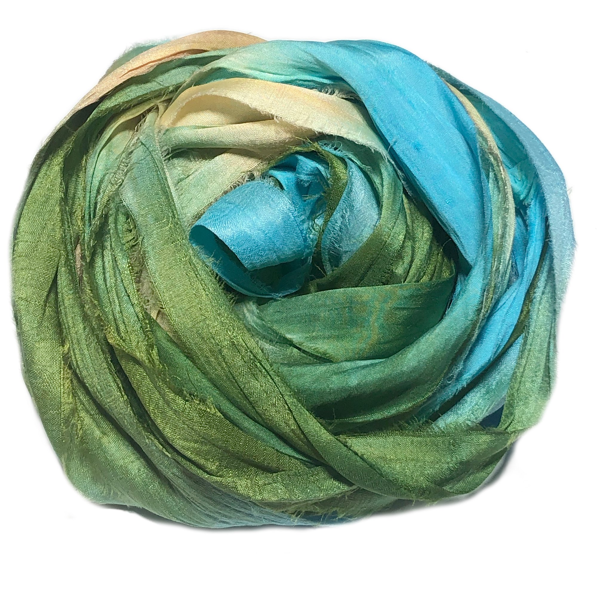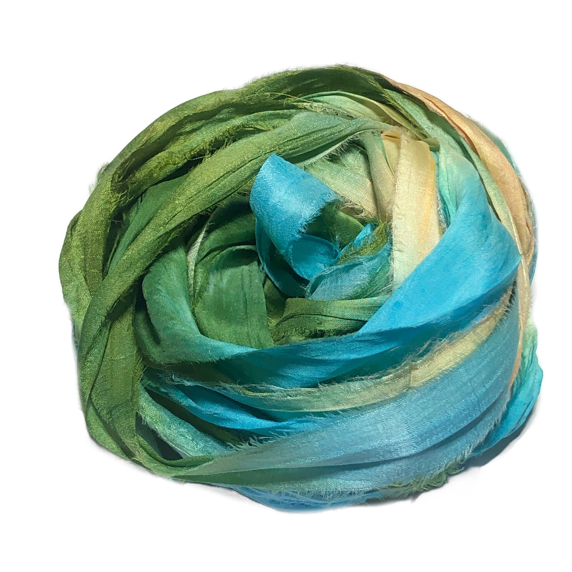 HAND DYED SARI SILK BUNDLES, ARE MADE OF 100% PURE SILK. THIS RECYCLED SILK RIBBON HAS BEEN HAND DYED TO THE BEAUTIFUL SOLIDS OR VARIATED COLOR YOU SEE IN EACH OF OUR UNIQUE BUNDLES.