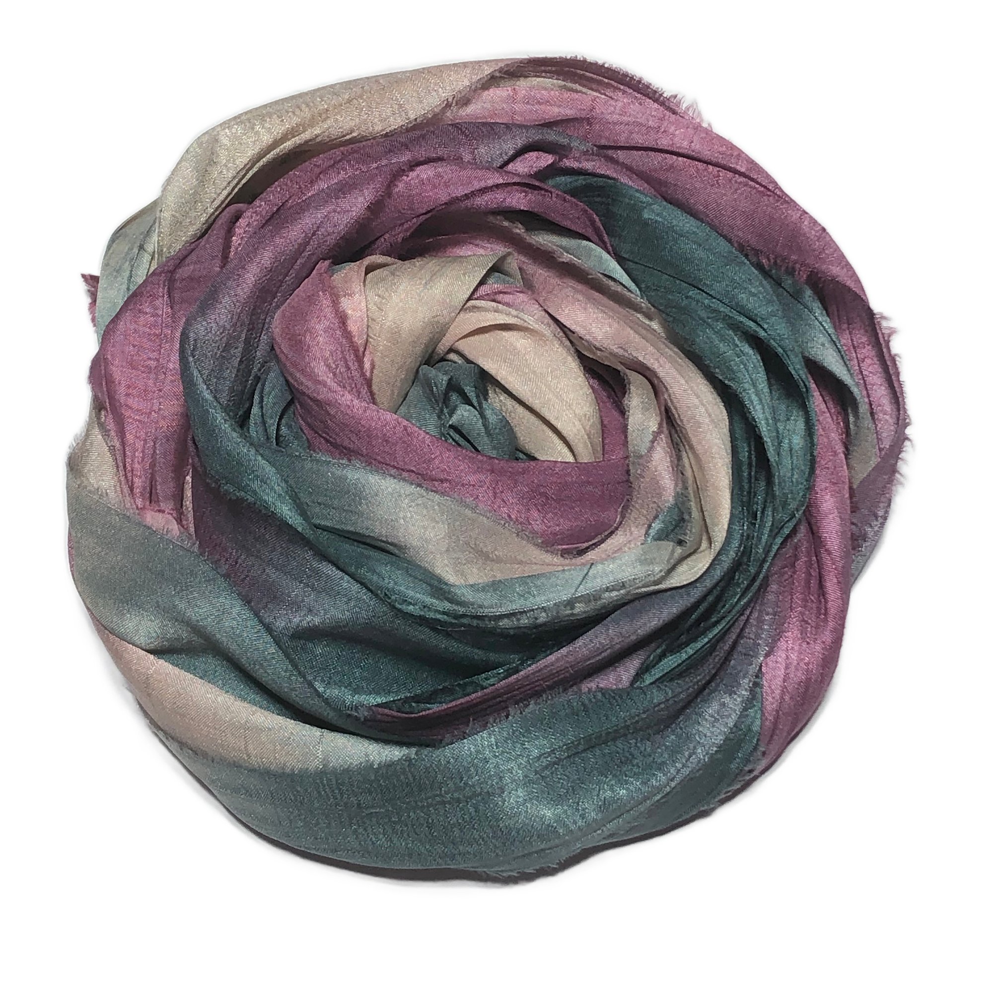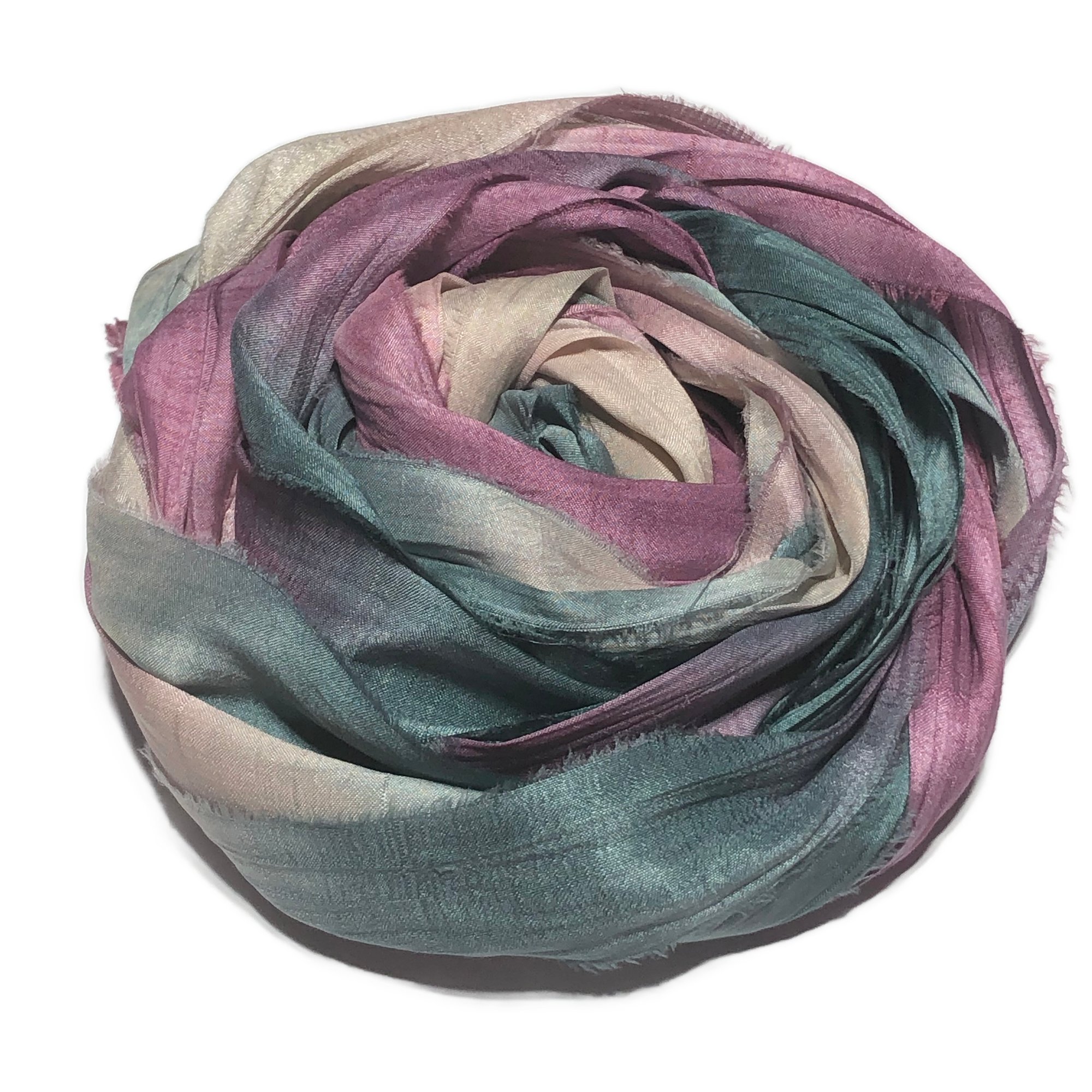 HAND DYED SARI SILK BUNDLES, ARE MADE OF 100% PURE SILK. THIS RECYCLED SILK RIBBON HAS BEEN HAND DYED TO THE BEAUTIFUL SOLIDS OR VARIATED COLOR YOU SEE IN EACH OF OUR UNIQUE BUNDLES.