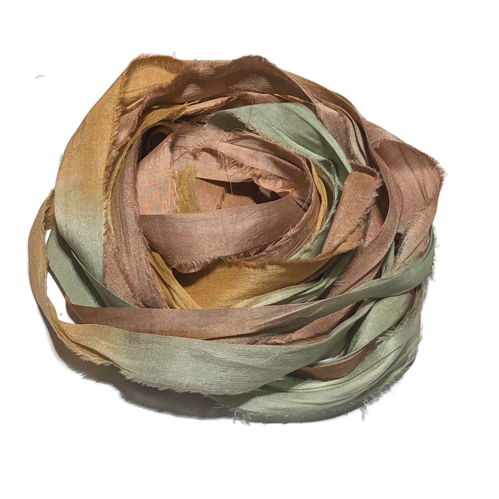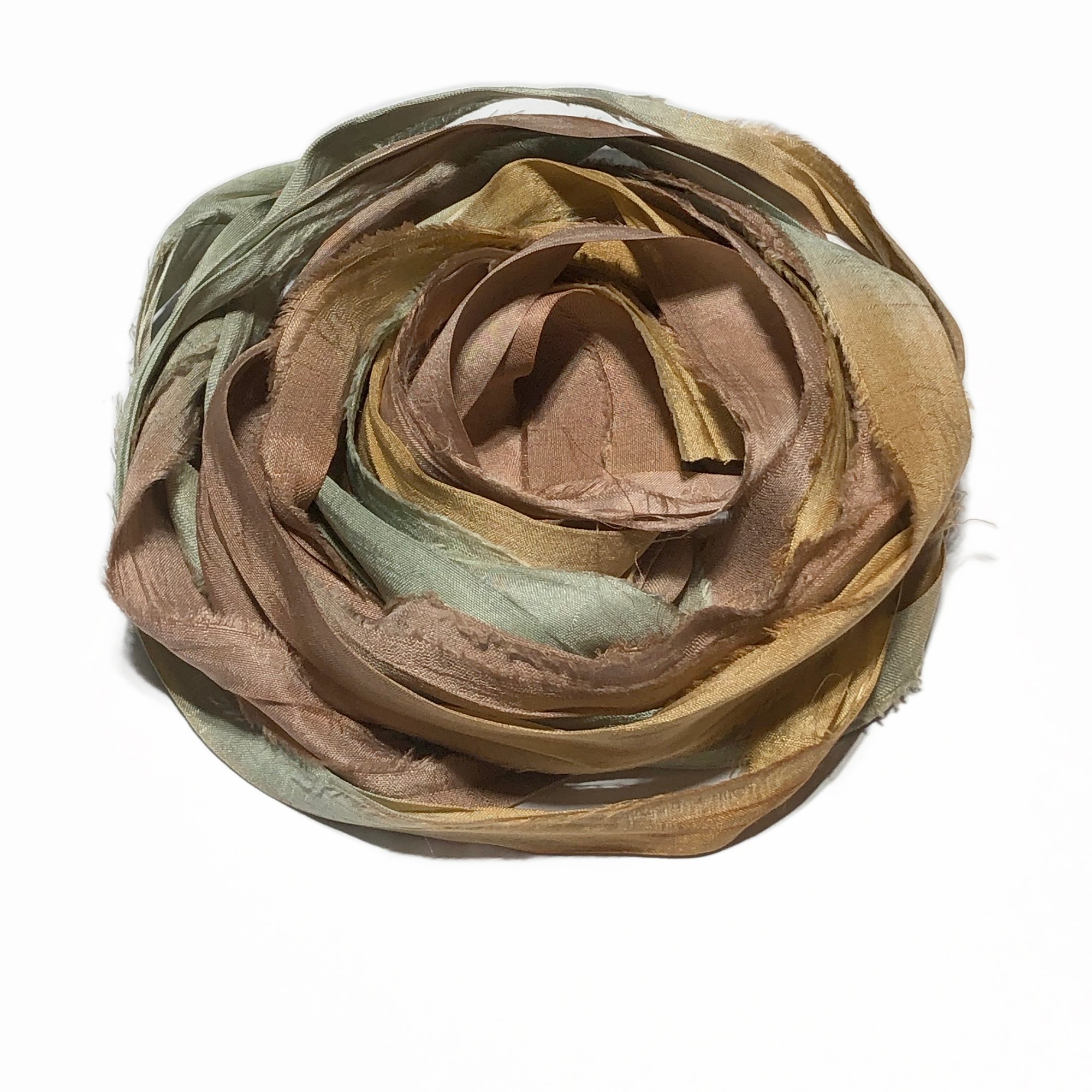 HAND DYED SARI SILK BUNDLES, ARE MADE OF 100% PURE SILK. THIS RECYCLED SILK RIBBON HAS BEEN HAND DYED TO THE BEAUTIFUL SOLIDS OR VARIATED COLOR YOU SEE IN EACH OF OUR UNIQUE BUNDLES.