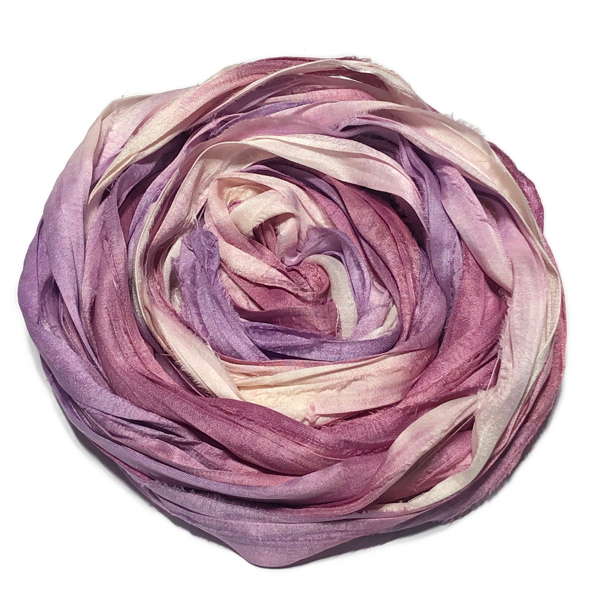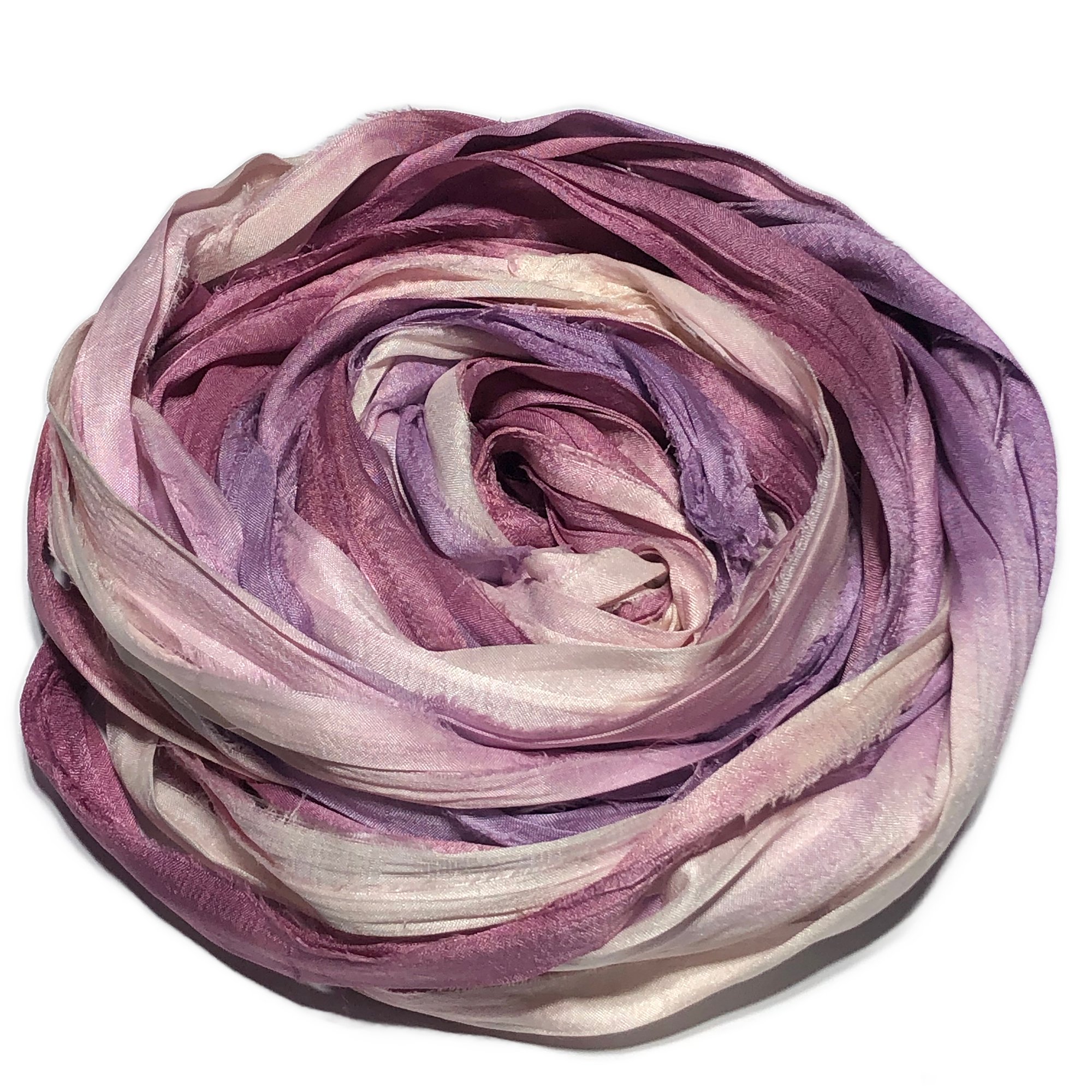 HAND DYED SARI SILK BUNDLES, ARE MADE OF 100% PURE SILK. THIS RECYCLED SILK RIBBON HAS BEEN HAND DYED TO THE BEAUTIFUL SOLIDS OR VARIATED COLOR YOU SEE IN EACH OF OUR UNIQUE BUNDLES.